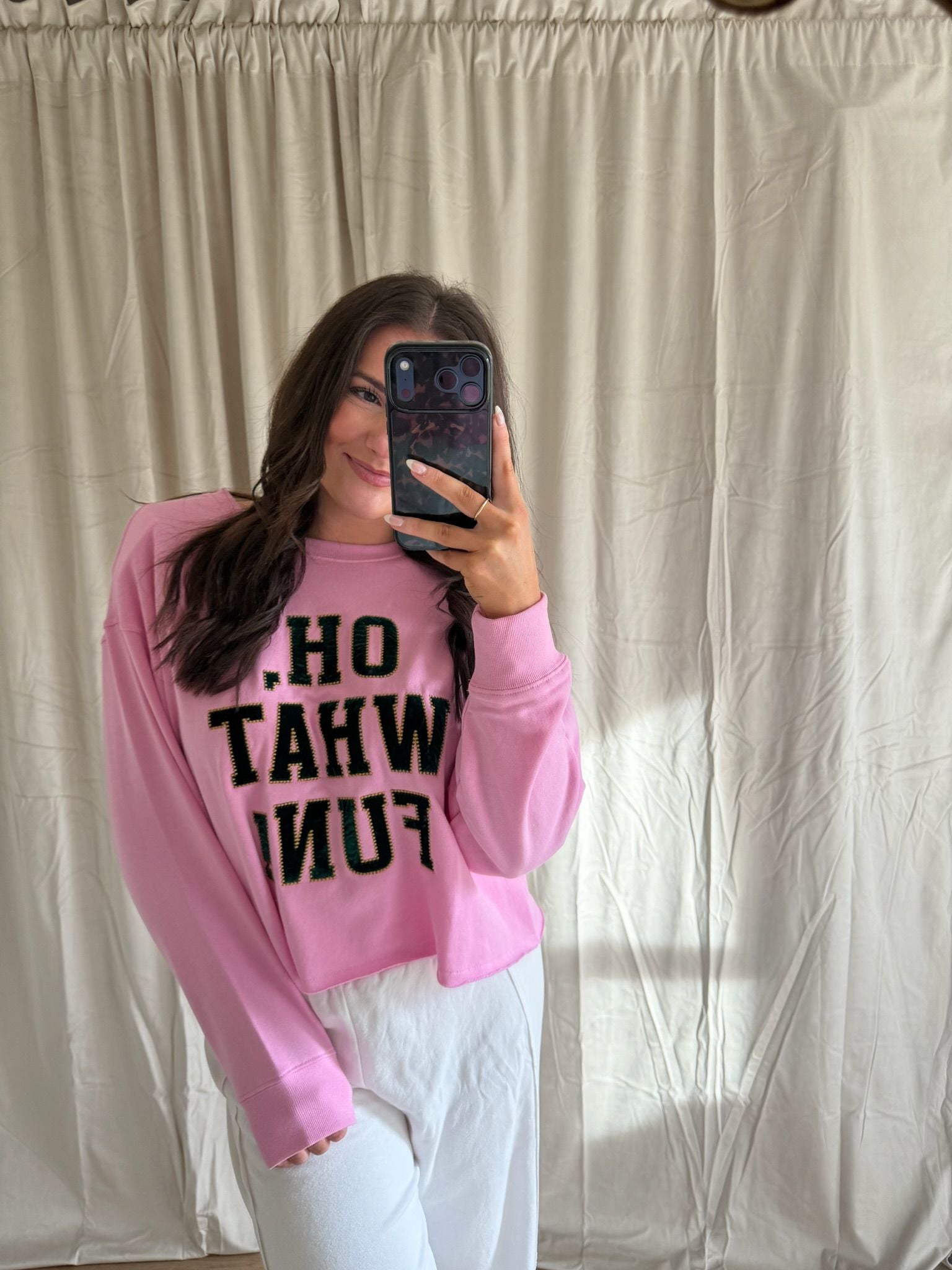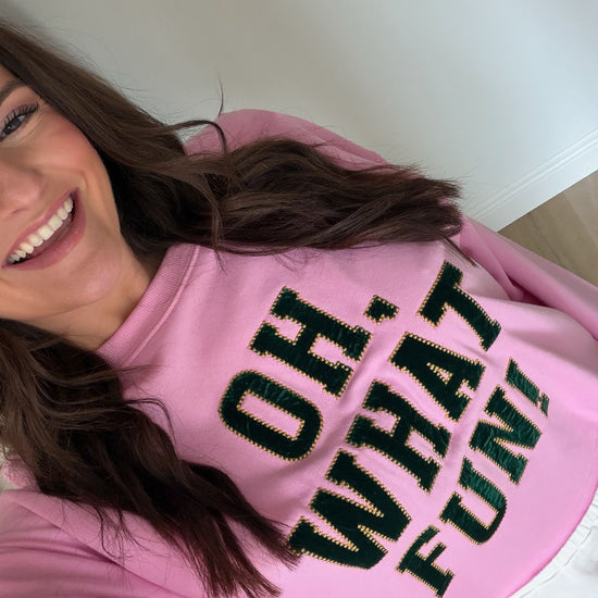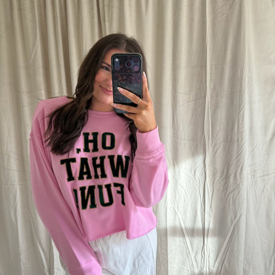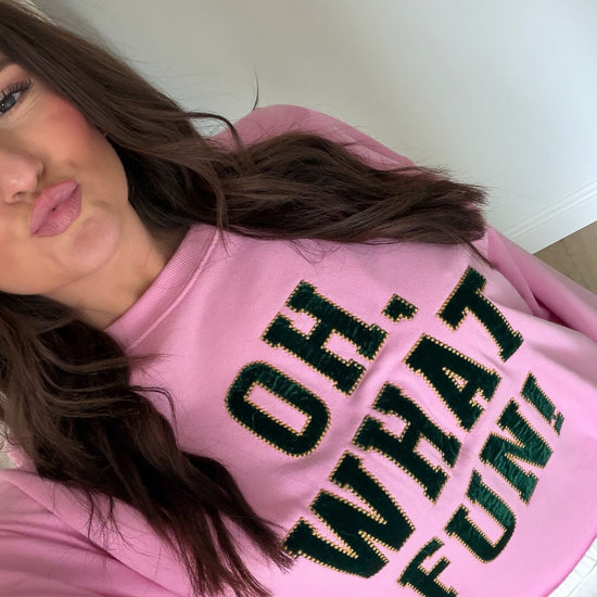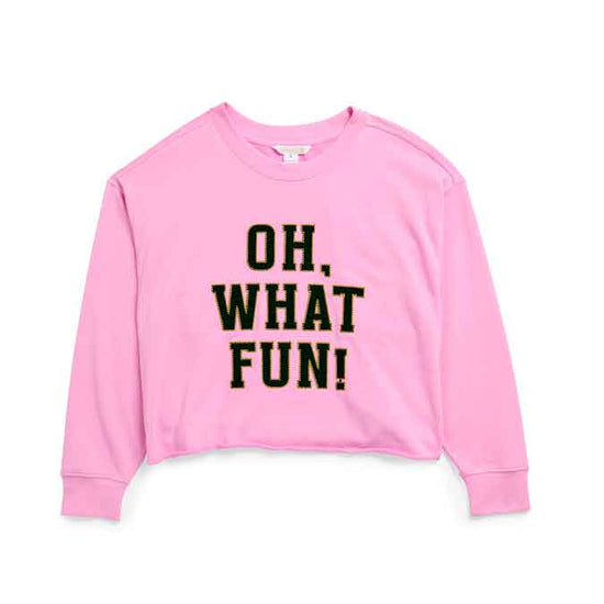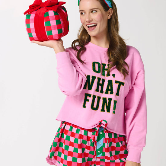 This cropped crewneck features bold green varsity-style lettering outlined in gold embroidery, all set against a playful pink background. Its relaxed fit makes it perfect for lounging, gift wrapping, or matching with your crew. Pair it with the coordinating Checkered Boxer Shorts —or mix and match with any of our other merry pieces for a festive look from head to toe.