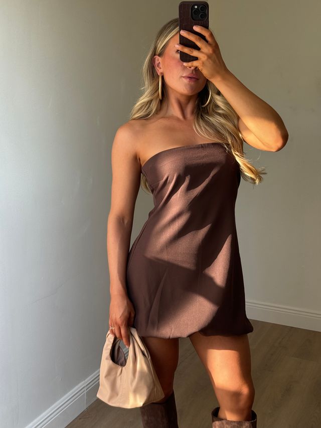 The Delilah Mini Dress combines chic style with playful comfort. Its strapless silhouette flows into a softly gathered blouson shape, finished with a bubbled hem that adds a whimsical touch. Perfect for any occasion, this dress offers a unique blend of structure and fun, making it a standout piece in your wardrobe.