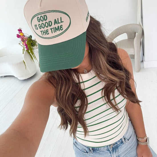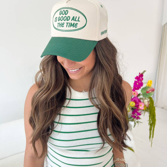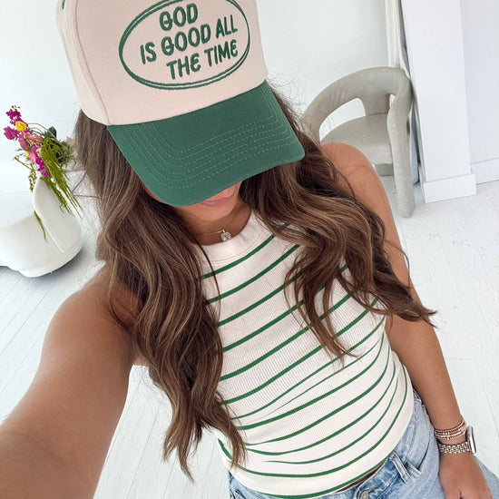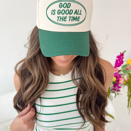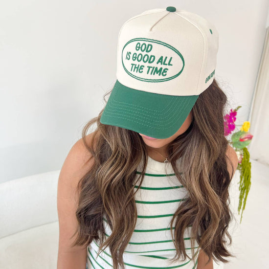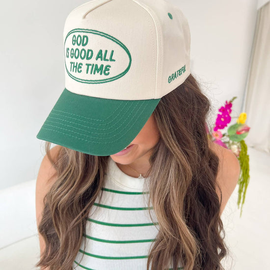God is good all the time! Vintage green trucker hat with adjustable snapback side embroidery