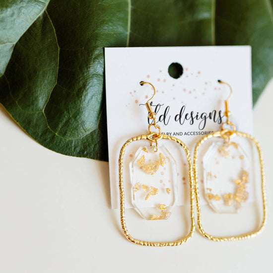 Discover the elegance of TLD Designs' Gold Flecks earrings. These dangle earrings beautifully combine metal and acrylic, resulting in a dazzling display of gold flecks. They are a testament to our brand's commitment to unique styles and emerging trends. From our humble beginnings with leather earrings, we now offer a variety of jewelry, and these earrings are a shining example of our craftsmanship. Add a touch of sparkle to your outfit with these stunning earrings.