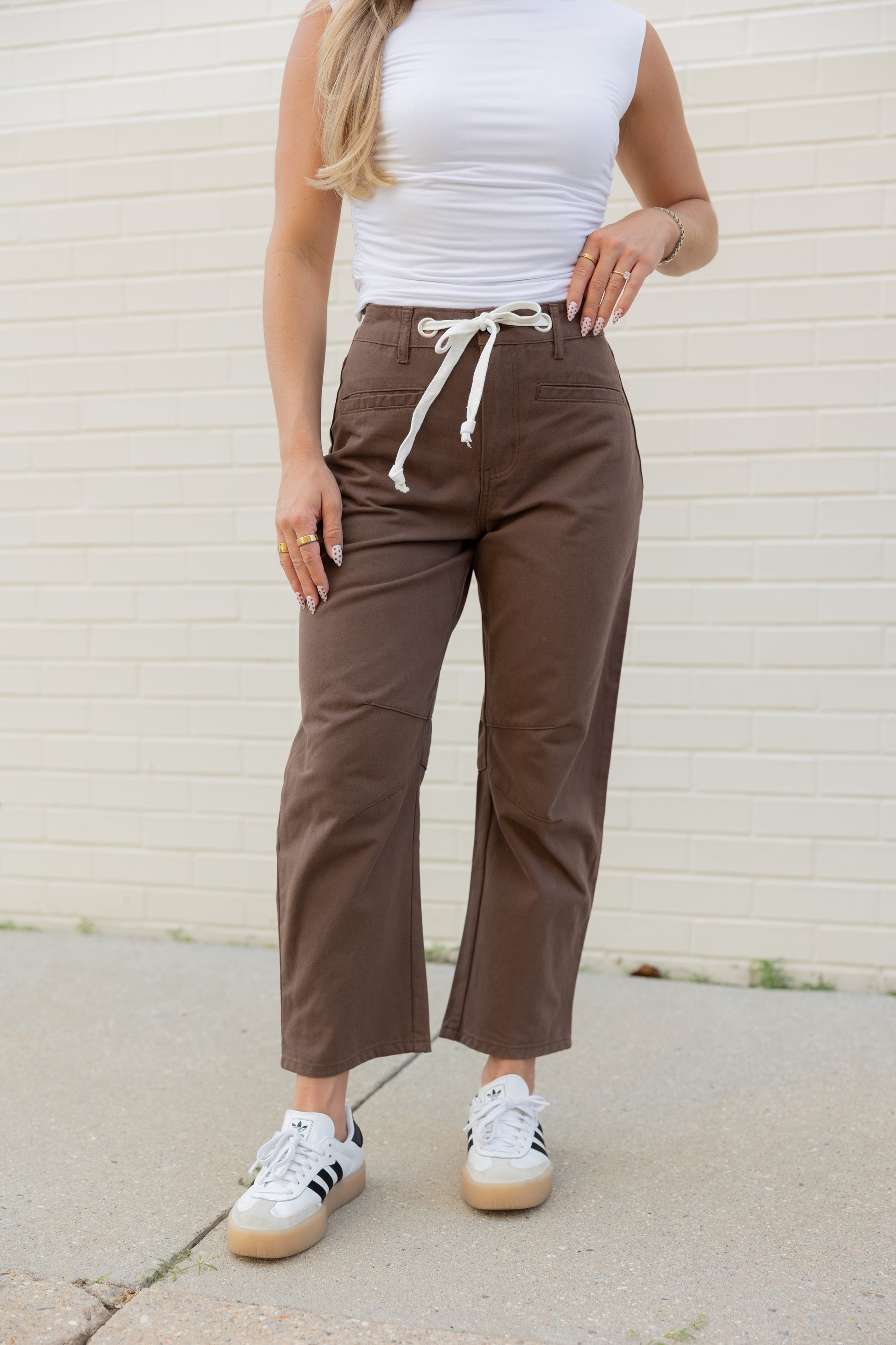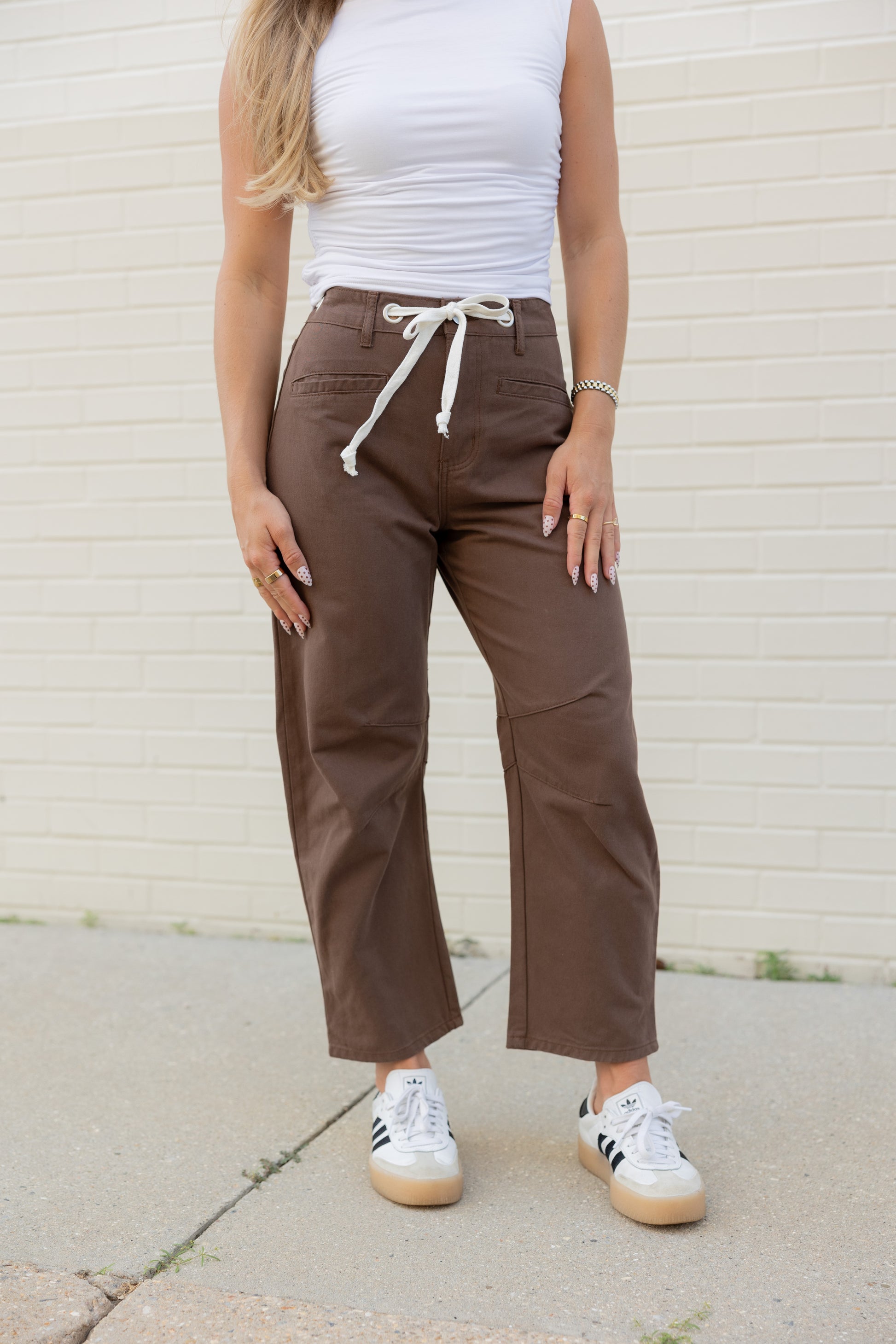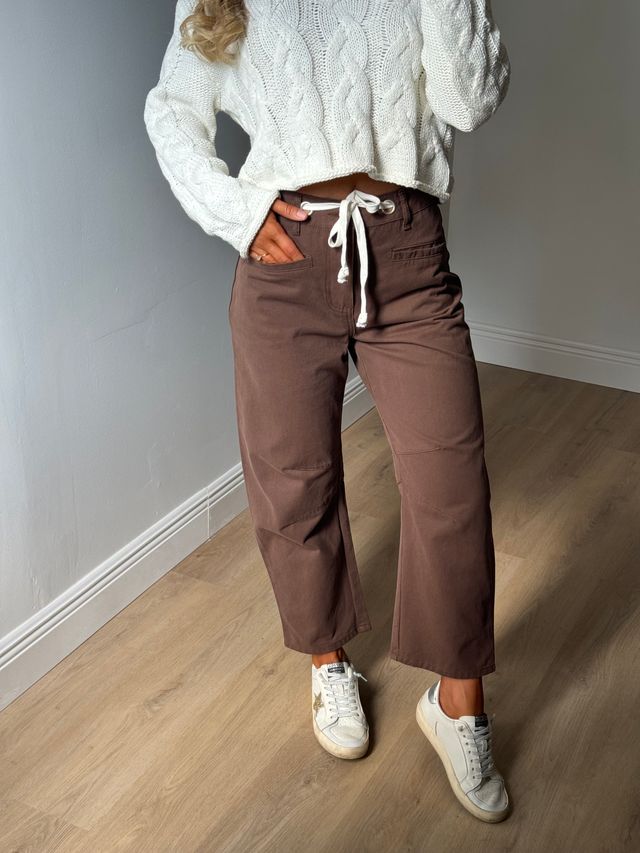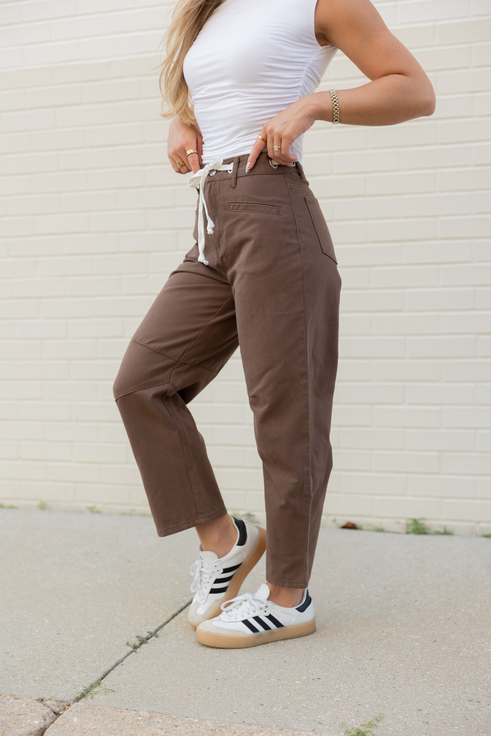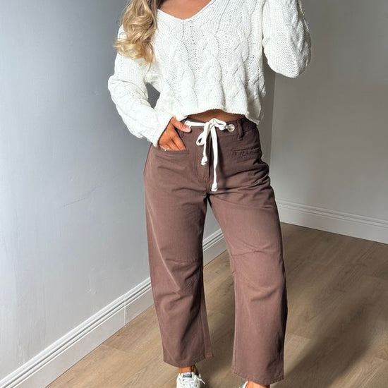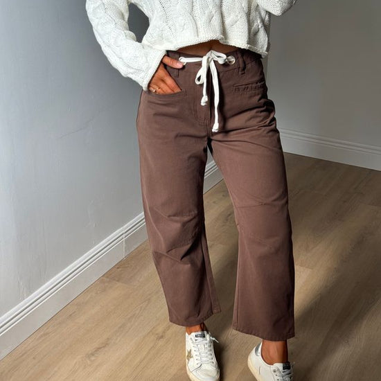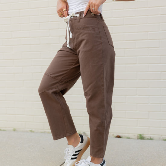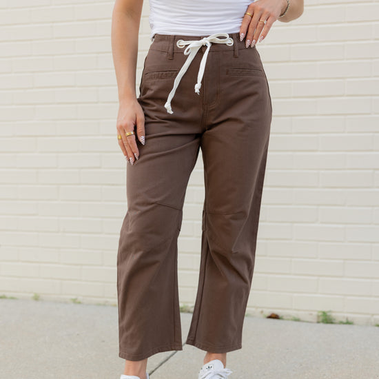 Step into fall with the Holly High Rise Barrel Jeans in a warm brown shade. Featuring a white drawstring adjustable waist tie, these jeans offer a comfy, customizable fit. Perfect for layering, they pair effortlessly with a lightweight top now or a cozy sweater when the temperatures cool down. Embrace all the autumn vibes with style and ease!
