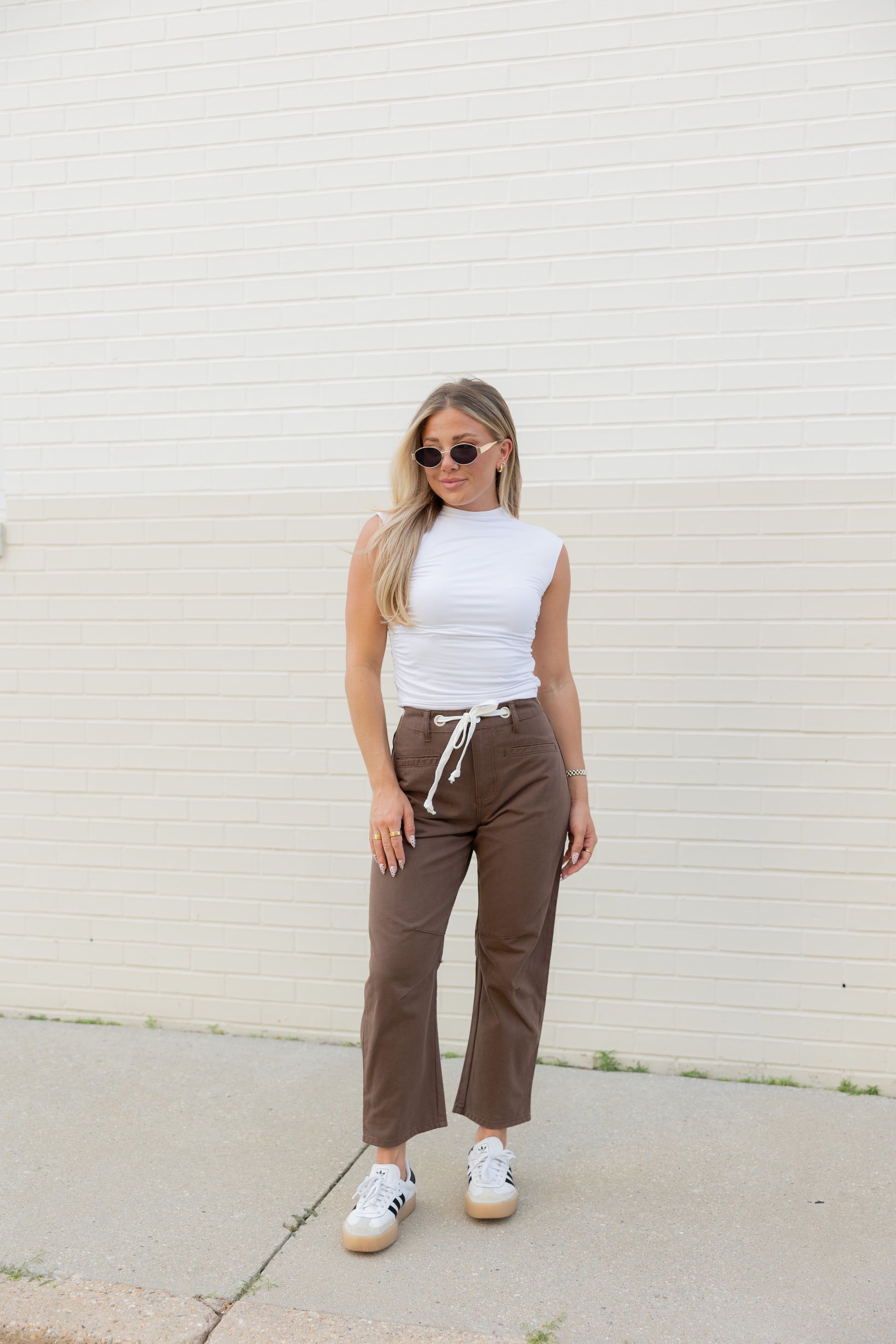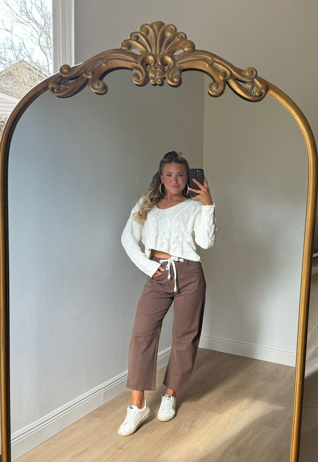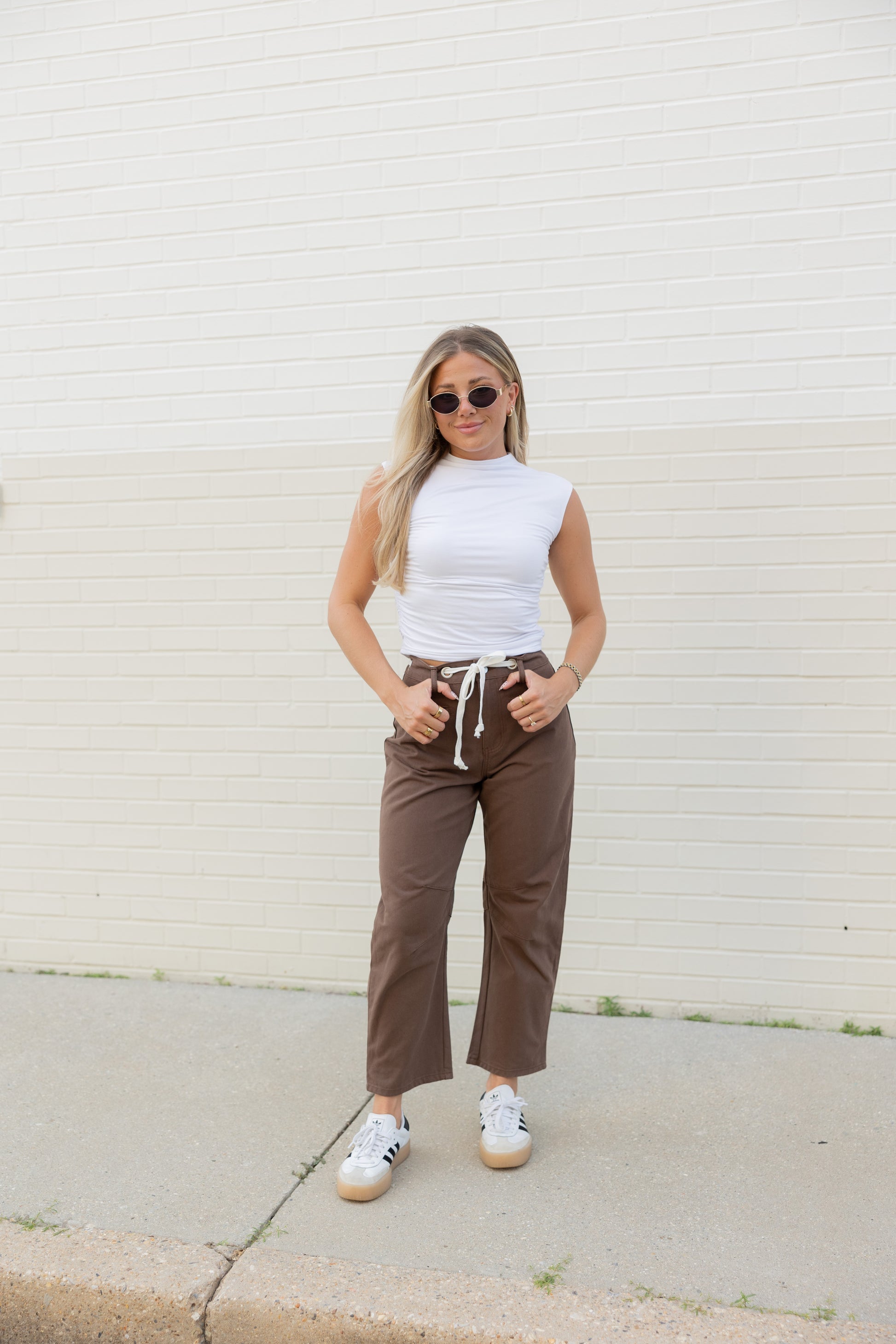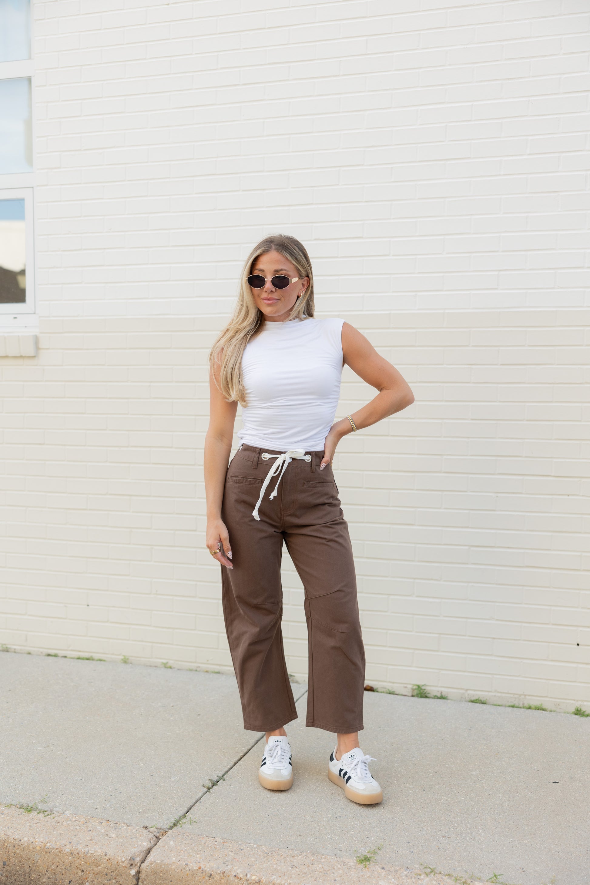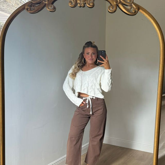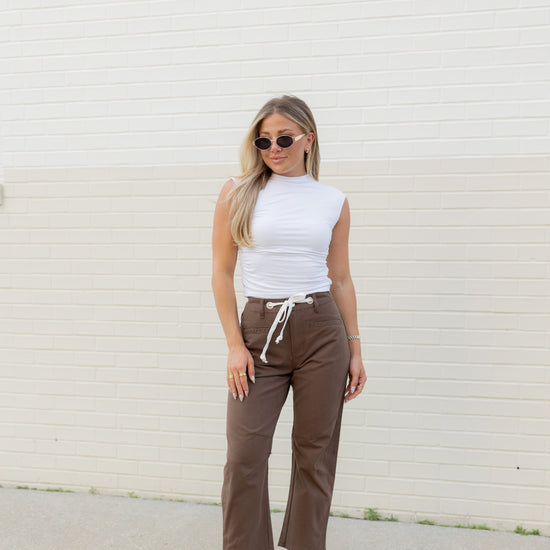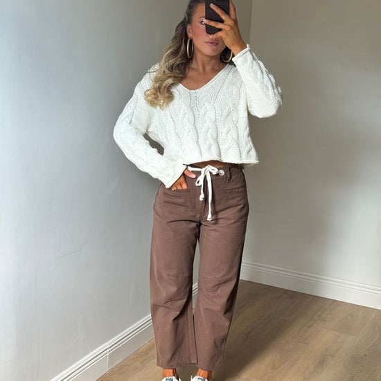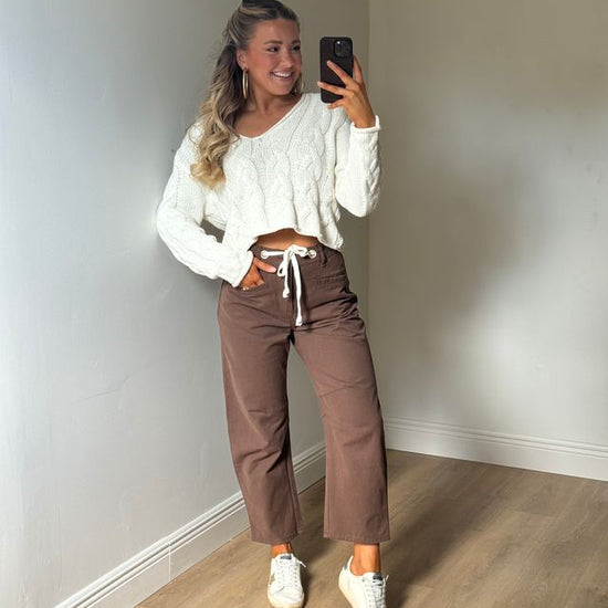 Step into fall with the Holly High Rise Barrel Jeans in a warm brown shade. Featuring a white drawstring adjustable waist tie, these jeans offer a comfy, customizable fit. Perfect for layering, they pair effortlessly with a lightweight top now or a cozy sweater when the temperatures cool down. Embrace all the autumn vibes with style and ease!