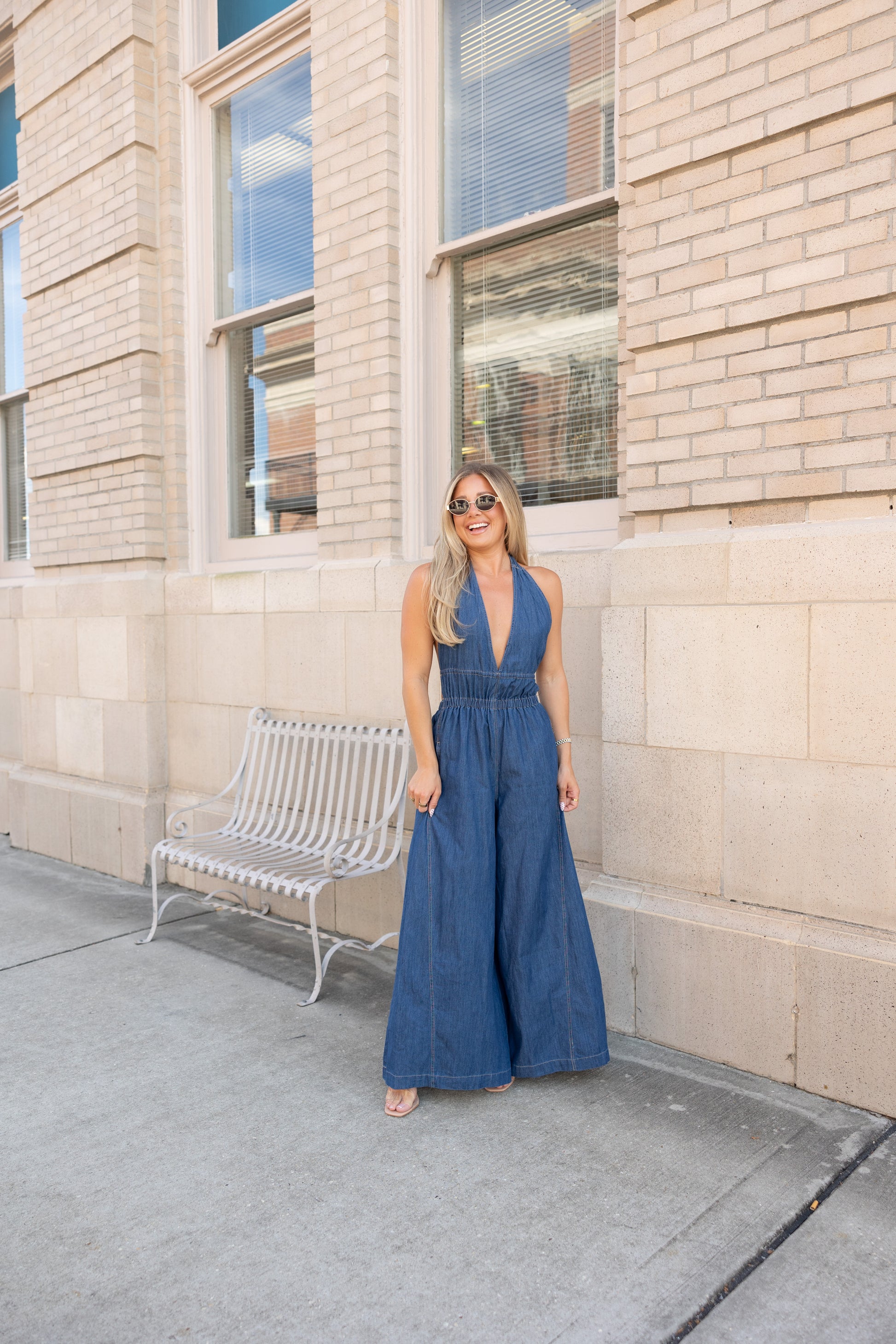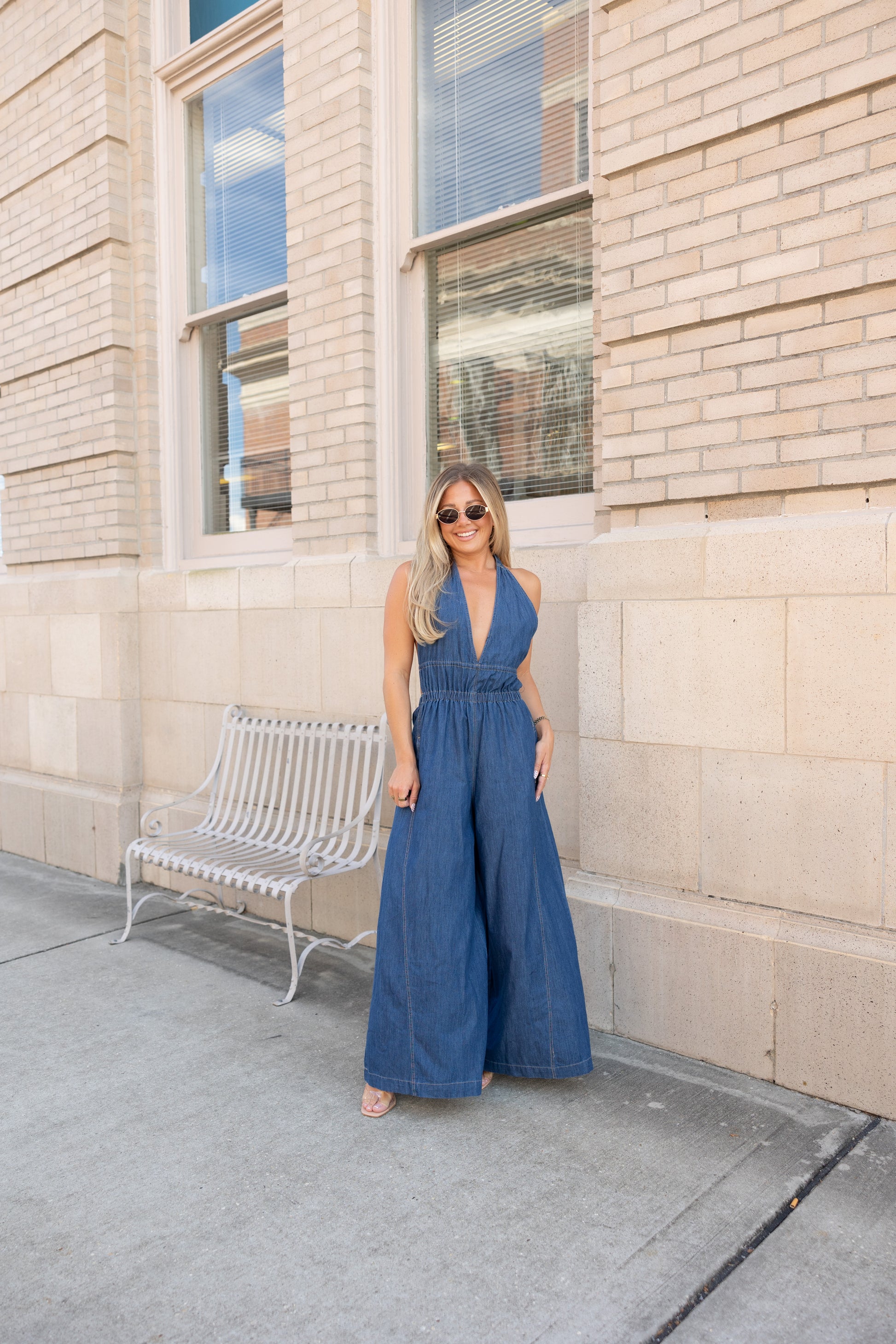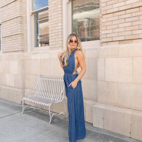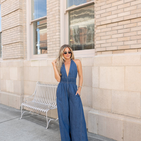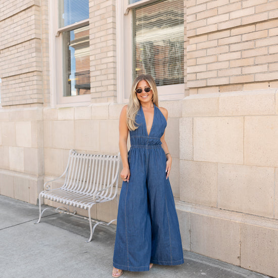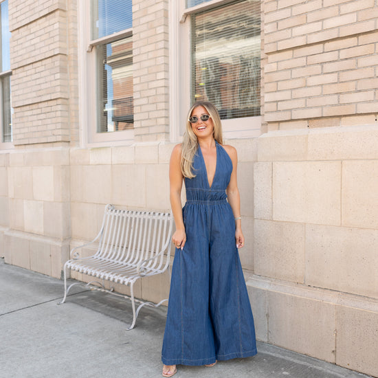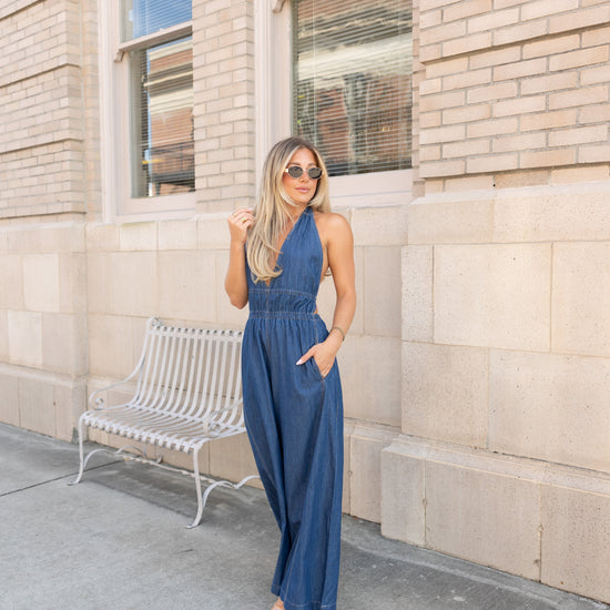 Step out in style with the Brooks Halter Wide Leg Jumpsuit, crafted from 100% cotton for breathable comfort. Featuring a playful halter neckline, smocked waist for a flattering fit, and an open back that adds a flirty touch. Wide legs and side pockets combine fashion with functionality, making this jumpsuit a fun statement piece for any occasion.