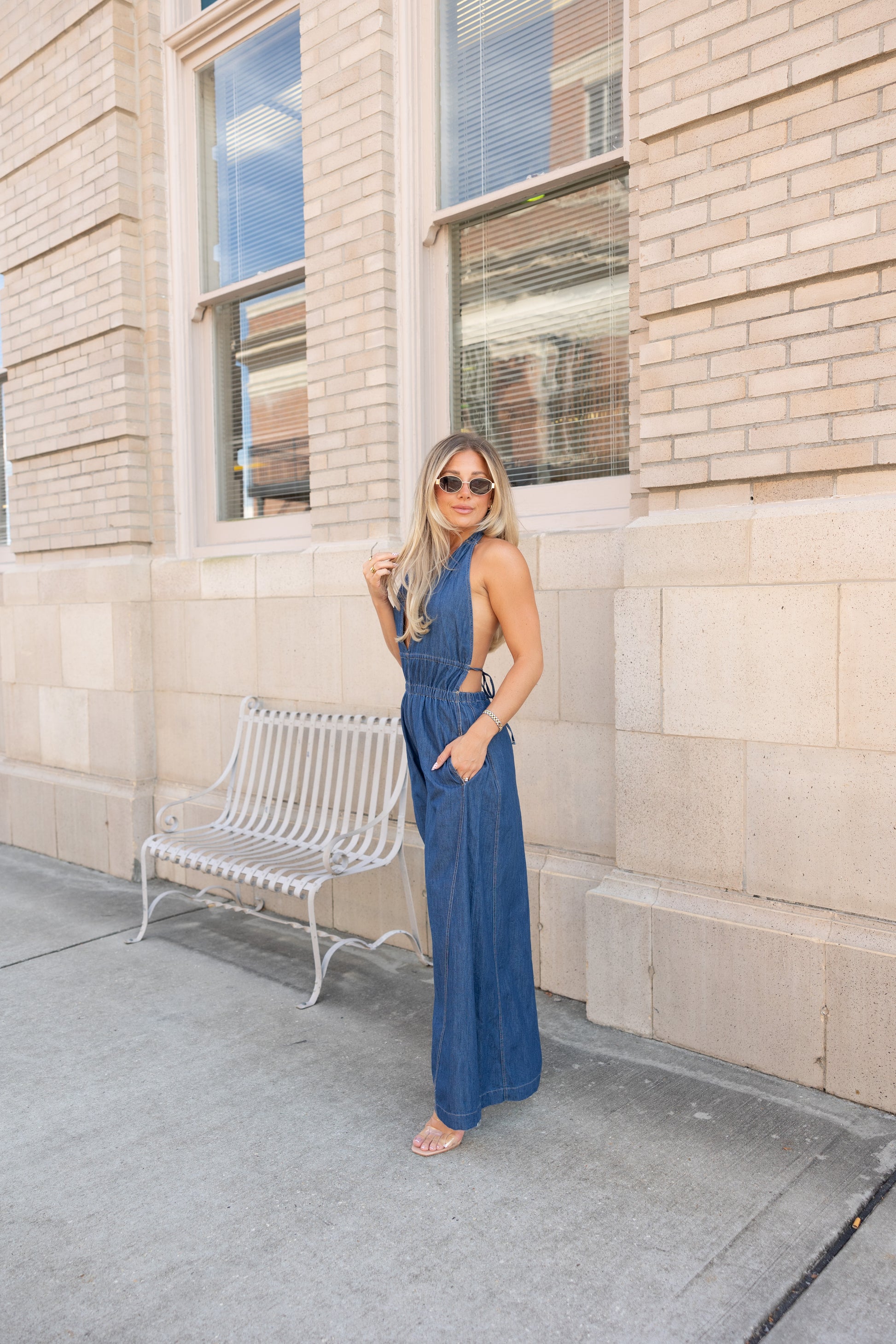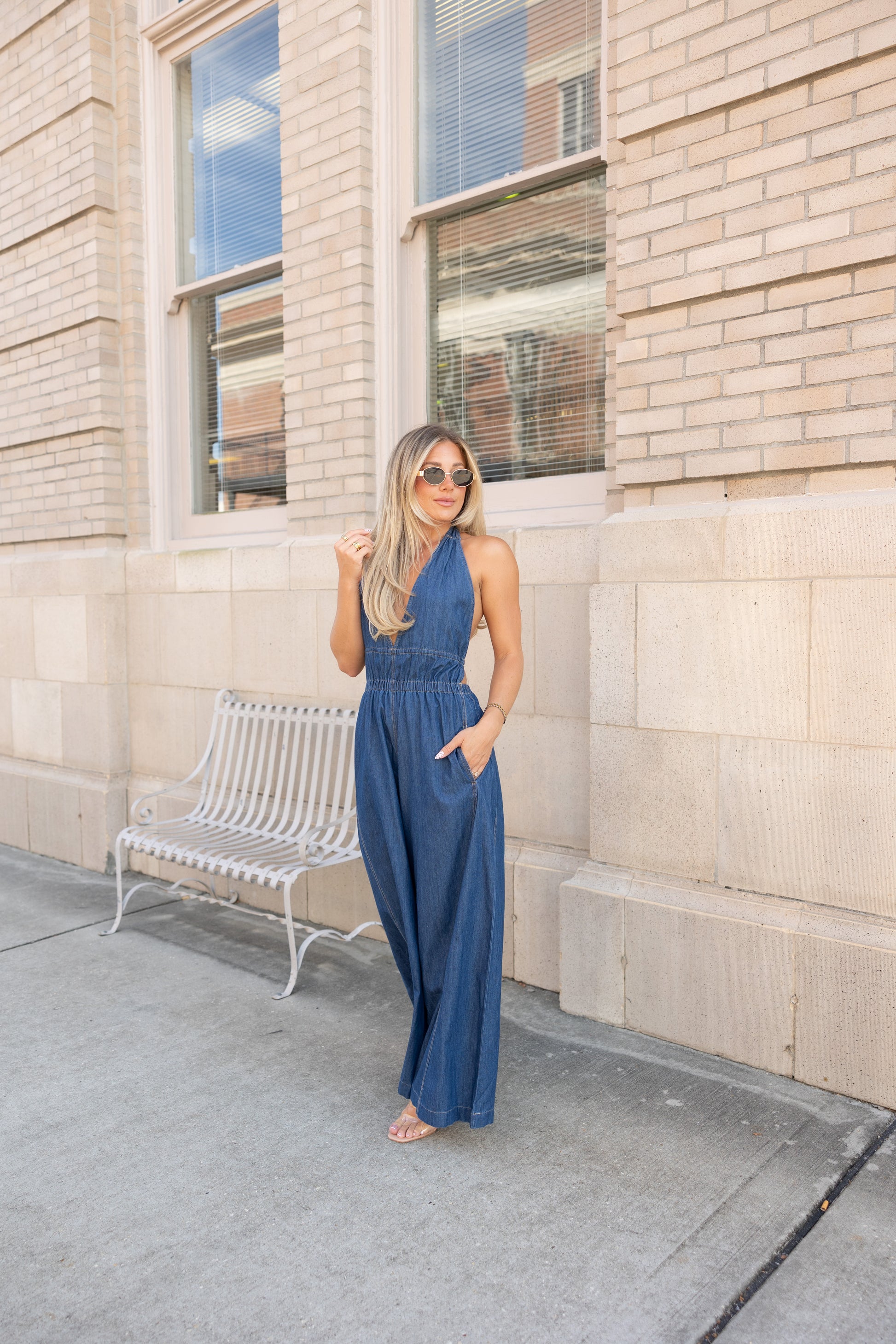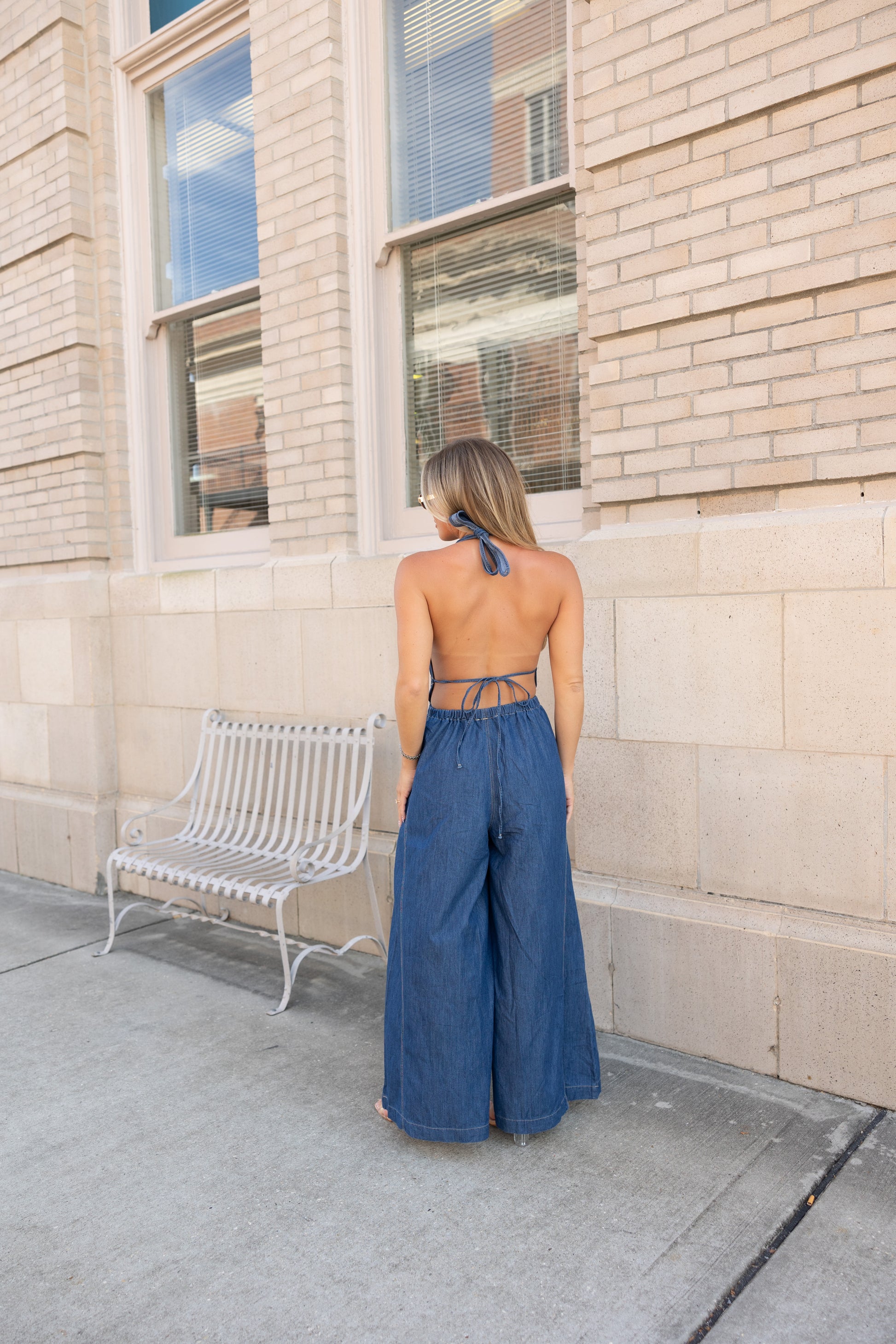 Step out in style with the Brooks Halter Wide Leg Jumpsuit, crafted from 100% cotton for breathable comfort. Featuring a playful halter neckline, smocked waist for a flattering fit, and an open back that adds a flirty touch. Wide legs and side pockets combine fashion with functionality, making this jumpsuit a fun statement piece for any occasion.