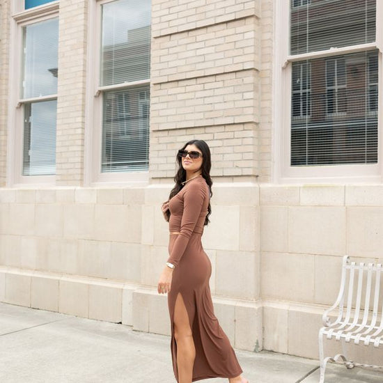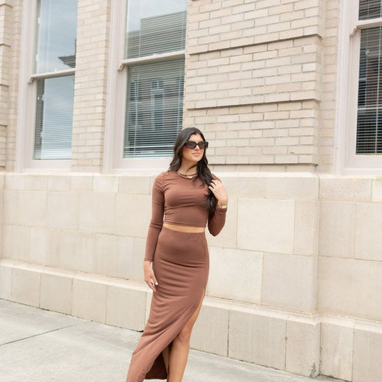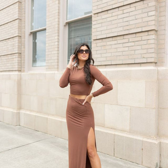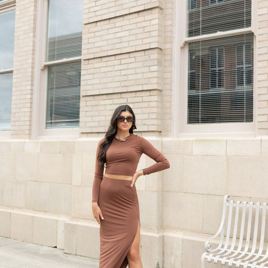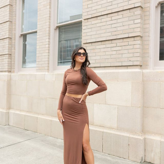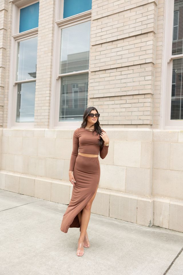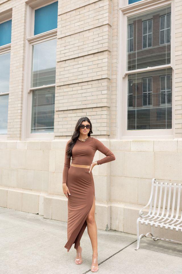 Turn heads with this playful two-piece set featuring a fitted long sleeve crop top and a high slit maxi skirt. Crafted from soft, stretchy fabric, it offers a flattering fit that moves with you. Perfect for any occasion, wear them together for an effortlessly chic look or mix and match to keep your style fresh. Comfortable, stylish, and just a little bit flirty—this set is your new go-to for day or night fun.