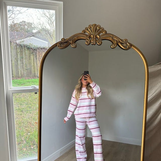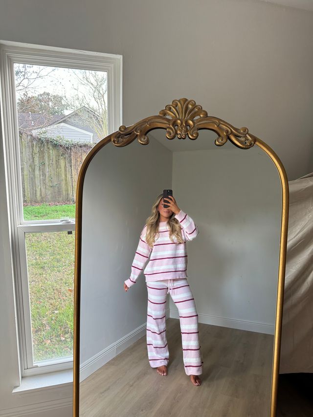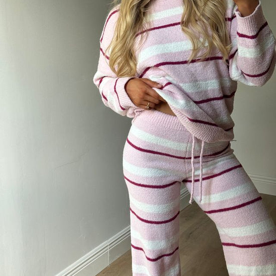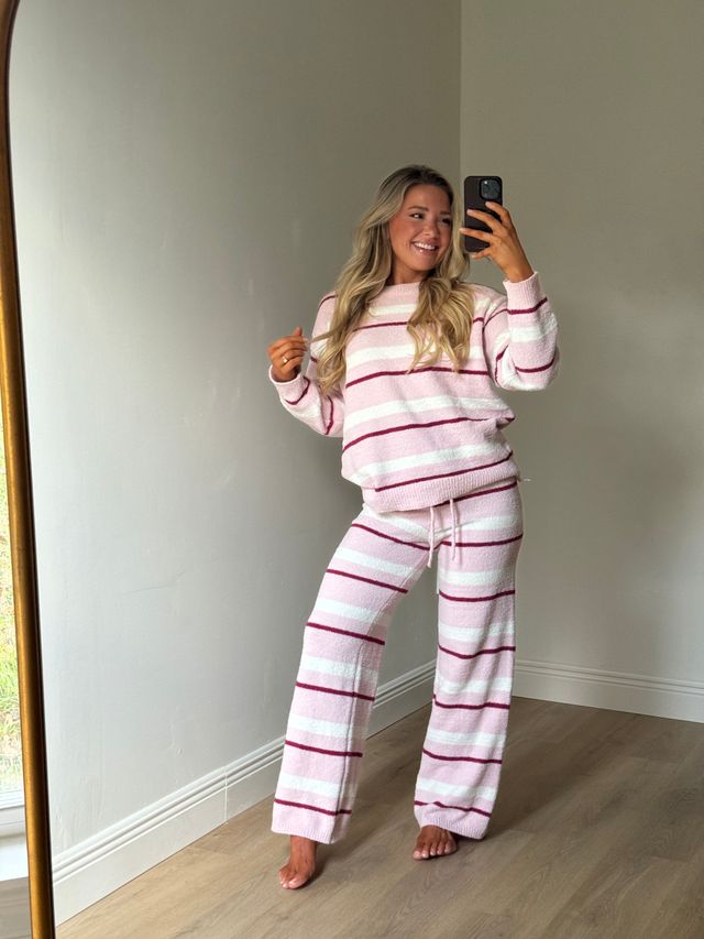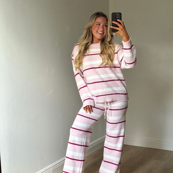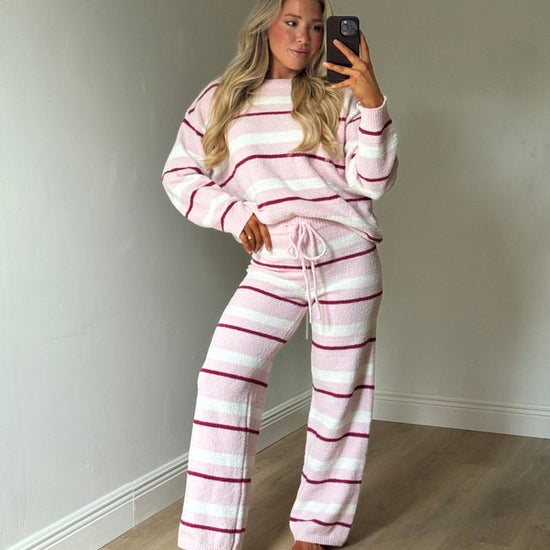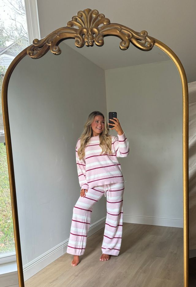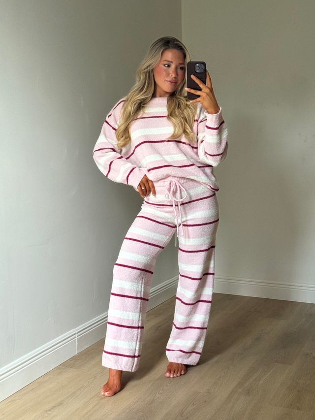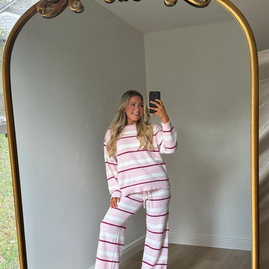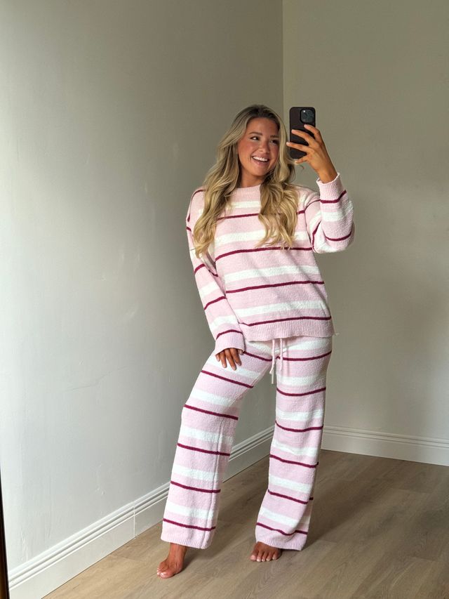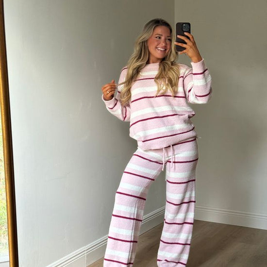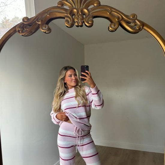 Introducing the Hattie Striped Comfy Set—your new go-to for cozy vibes and effortless style. This matching set features a dreamy baby pink base with charming stripes that instantly elevate your casual look. Crafted from incredibly soft fabric, it's the perfect companion for a lazy Valentine's night in or quick errands around town. Pair it with your favorite Uggs for that undeniably cute, comfortable aesthetic that makes you feel put-together without trying.