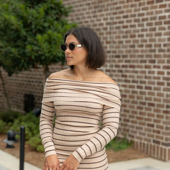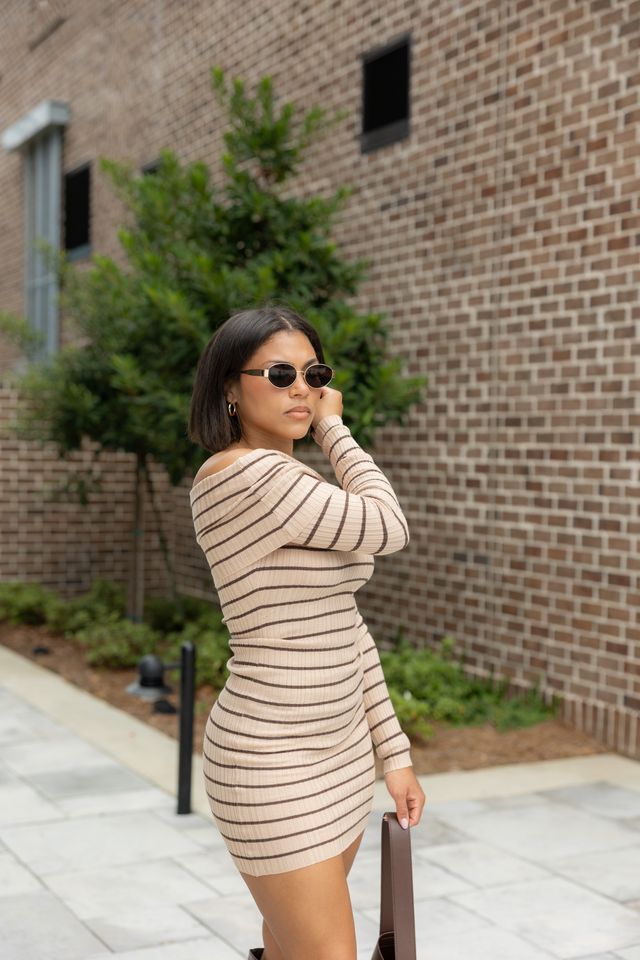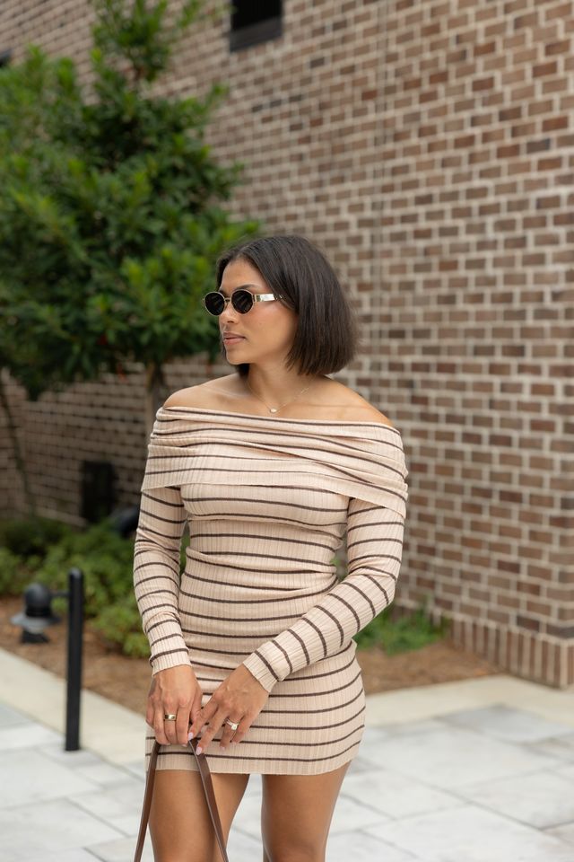 Chic And Versatile, Our Horizontal Stripe Knit Dress Defines Understated Elegance. The Off-Shoulder Neckline Accentuates The Collarbone, Providing A Sophisticated Canvas For Both Statement Necklaces And Delicate Pendants. Meticulously Crafted With A Body-Hugging Silhouette, The Dress Showcases A Series Of Horizontal Stripes, Creating A Visual Elongation. 57% Acrylic 28% Polyester 15% Nylon.