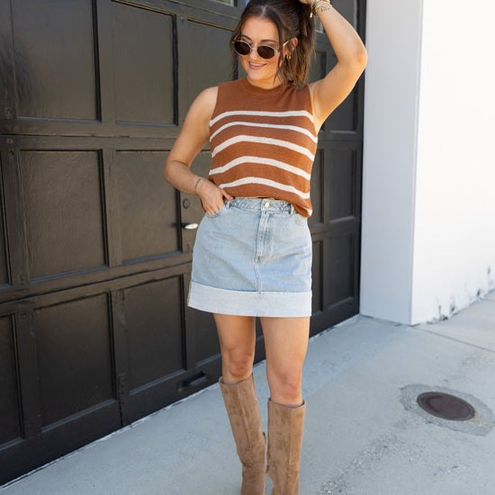 The Corie Striped Sleeveless Sweater Top combines the cozy feel of sweater material with a super lightweight design—ideal for layering as the leaves change. Featuring playful stripes in the perfect fall colors, this tank brings a fun and fresh twist to your autumn look. Light, comfy, and full of seasonal charm!