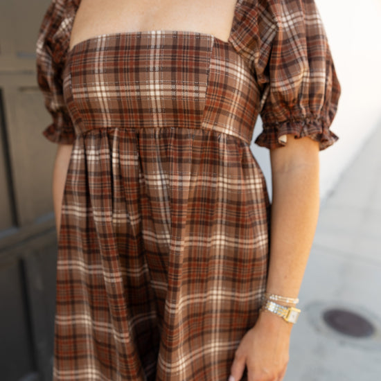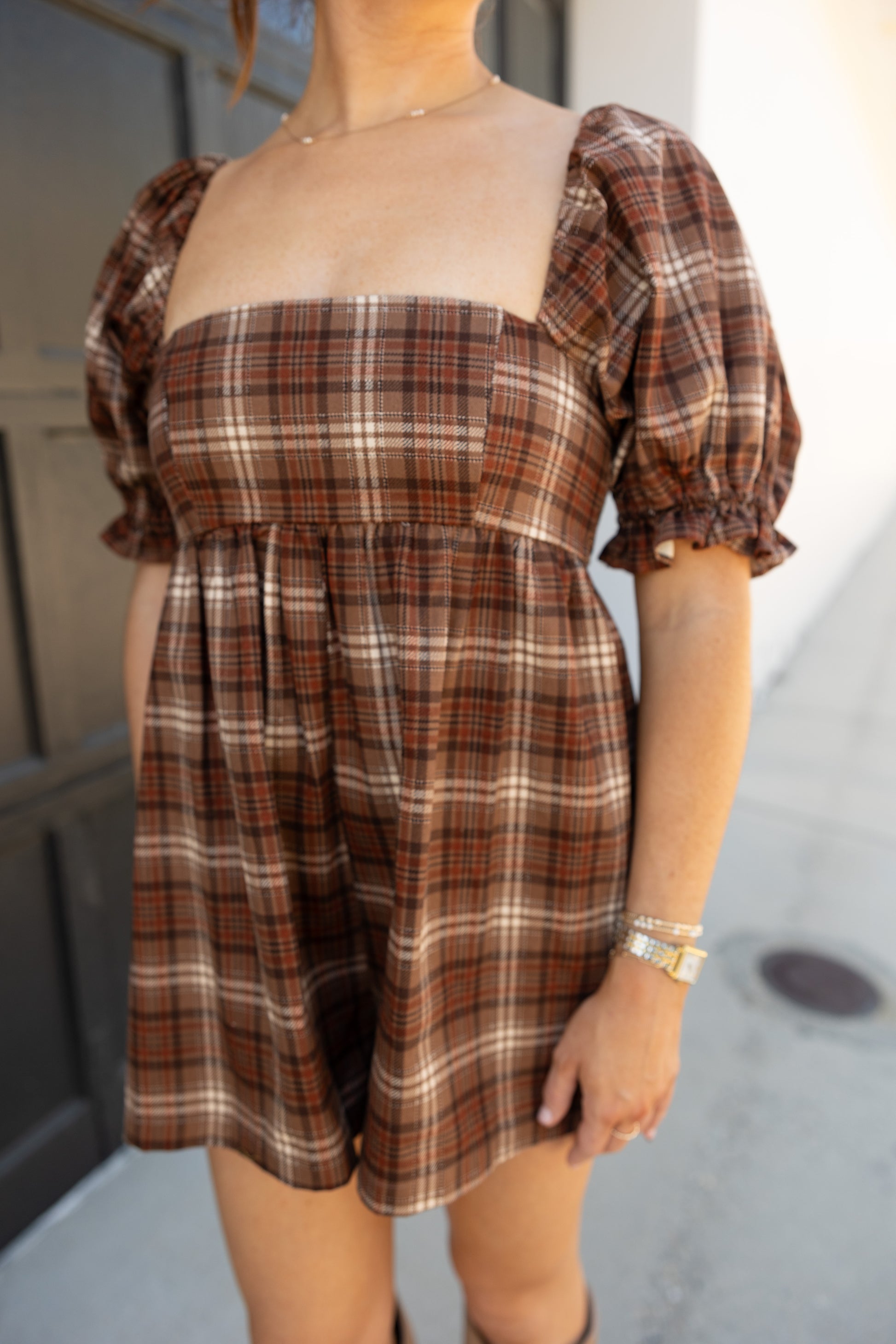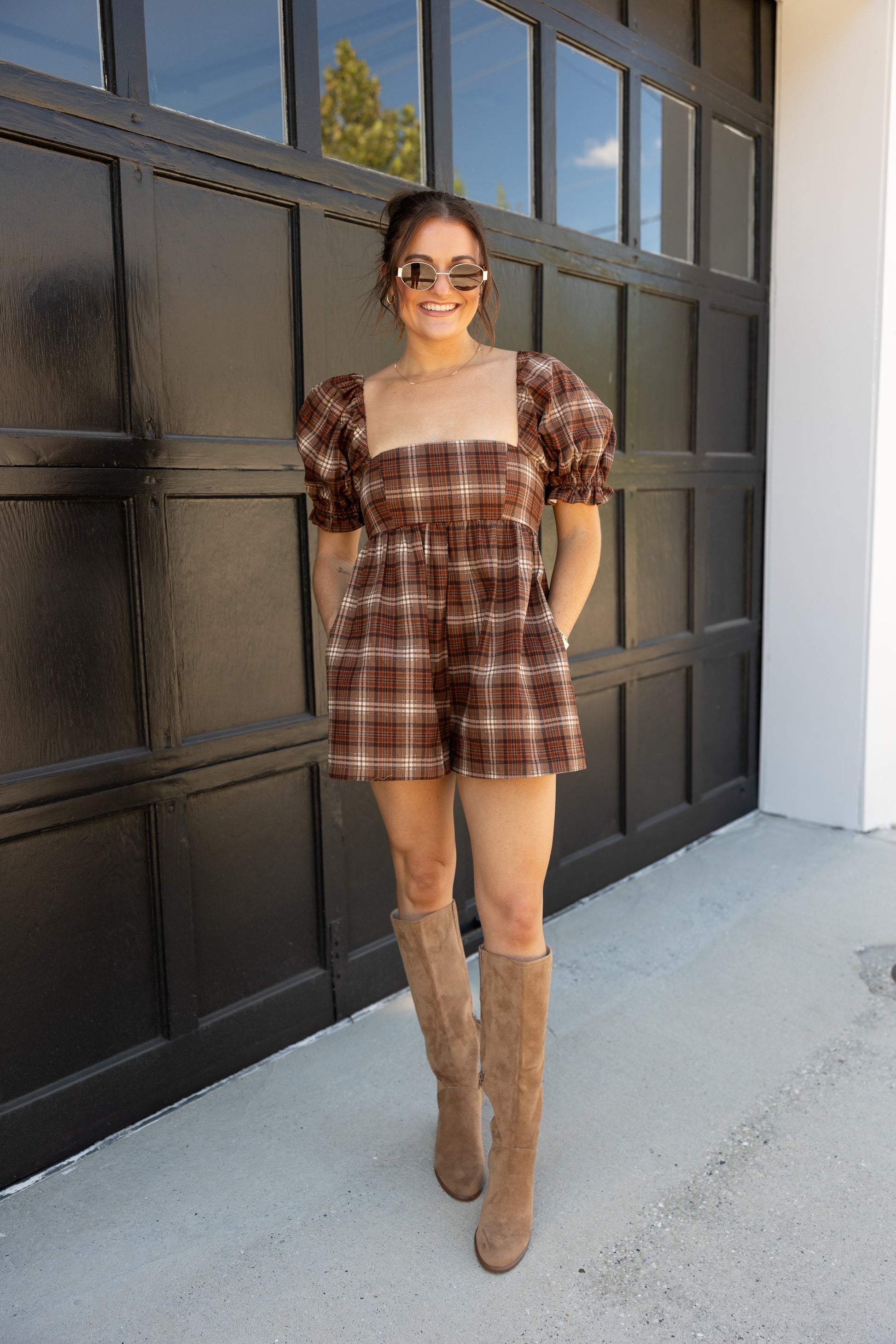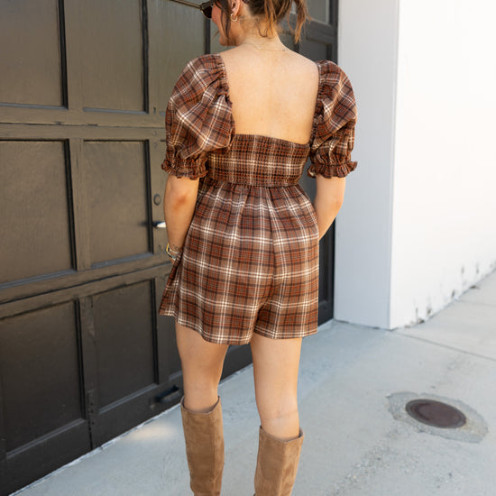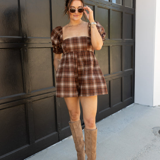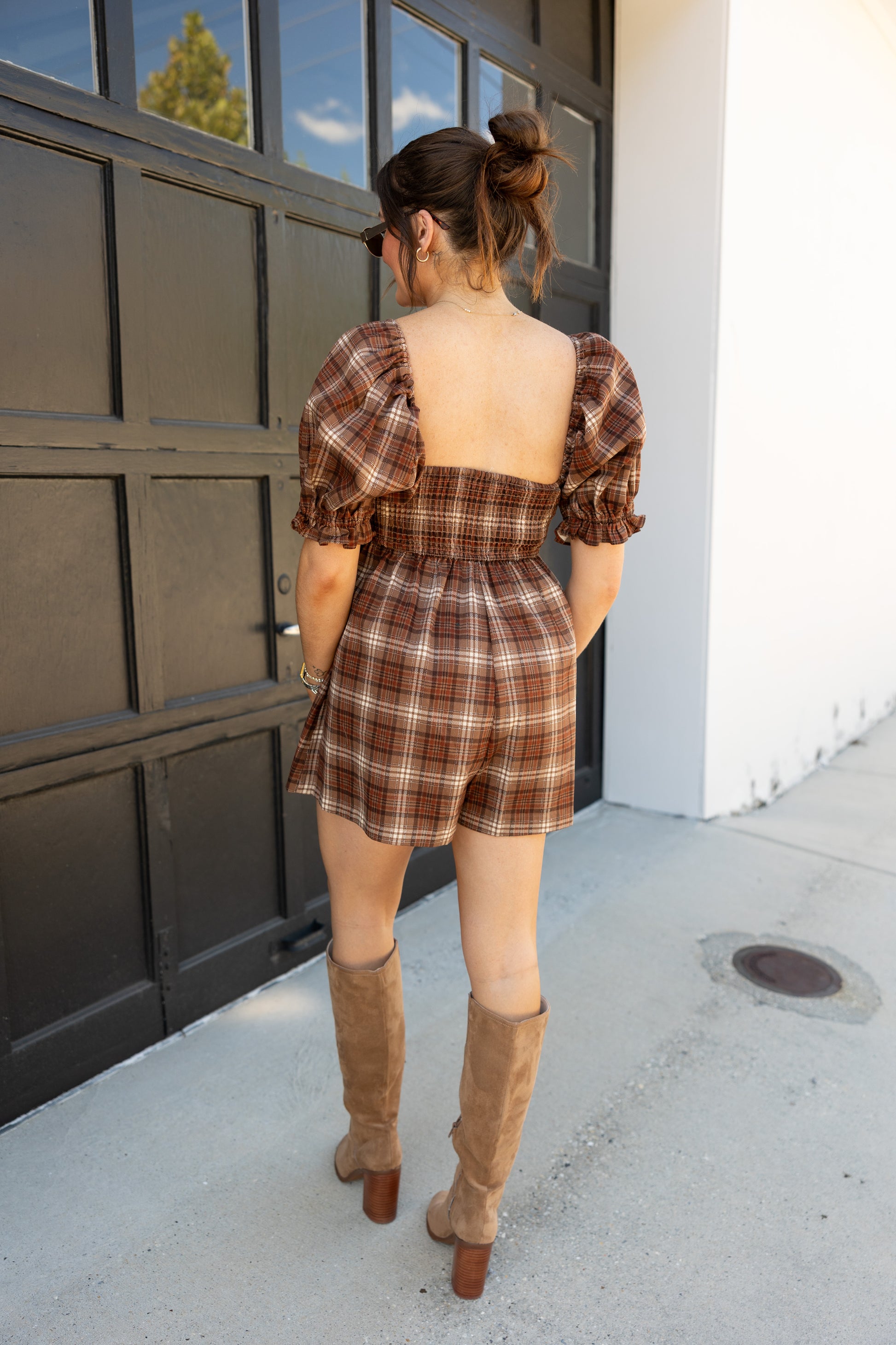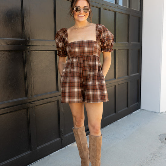 Our Sara Plaid Romper features a square neckline and back as well as a bubble sleeve.