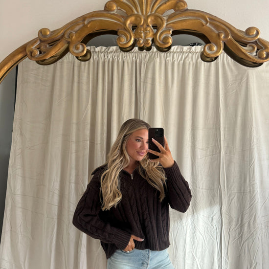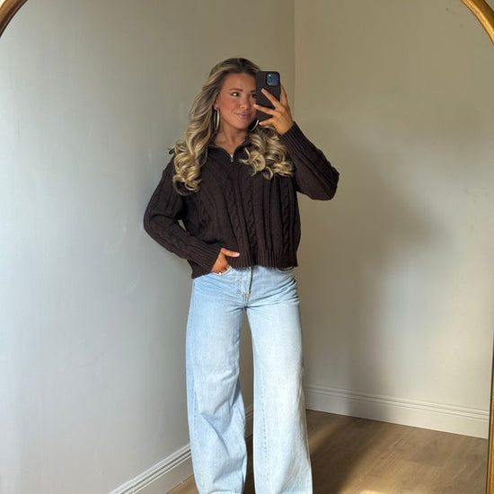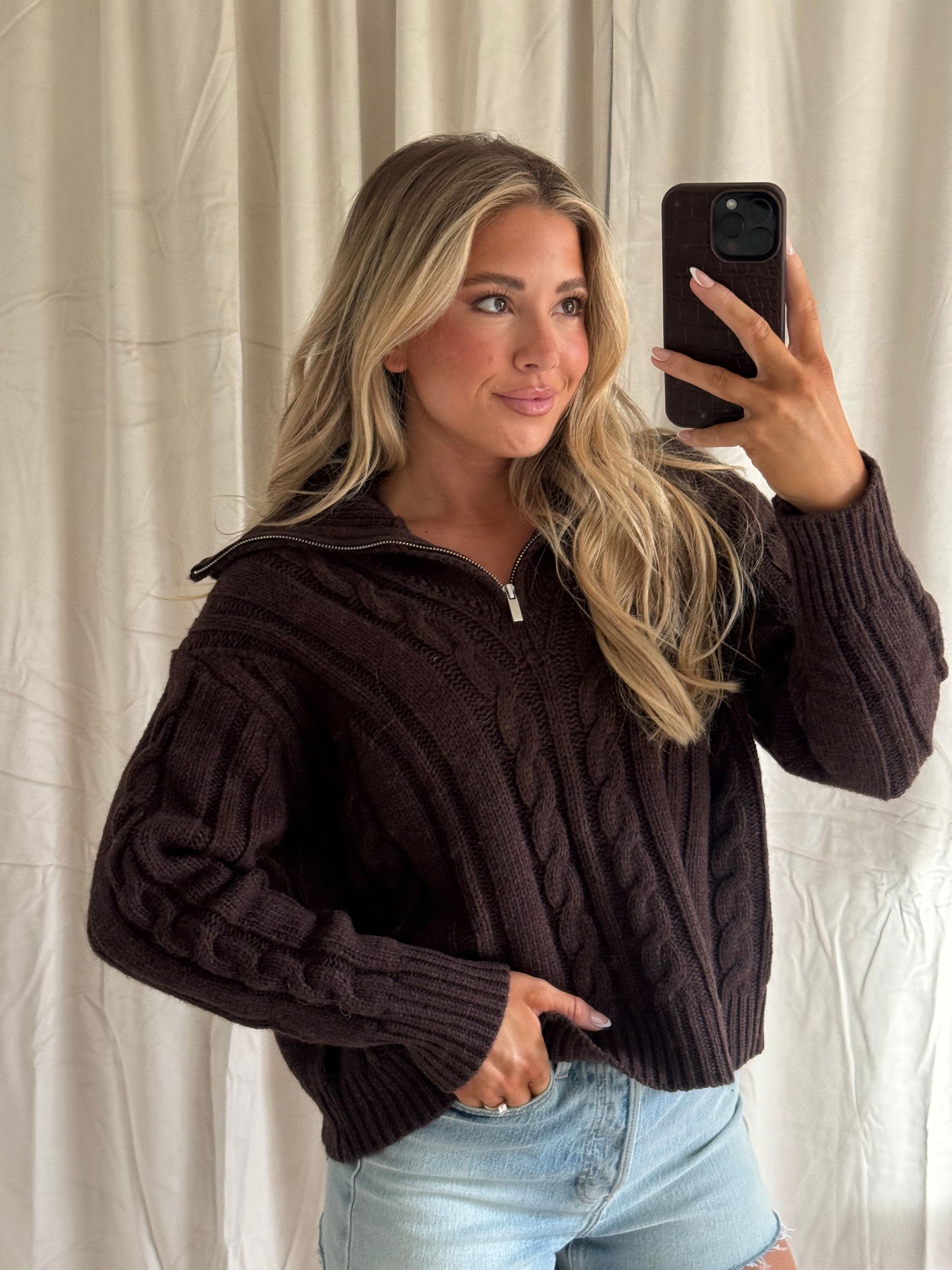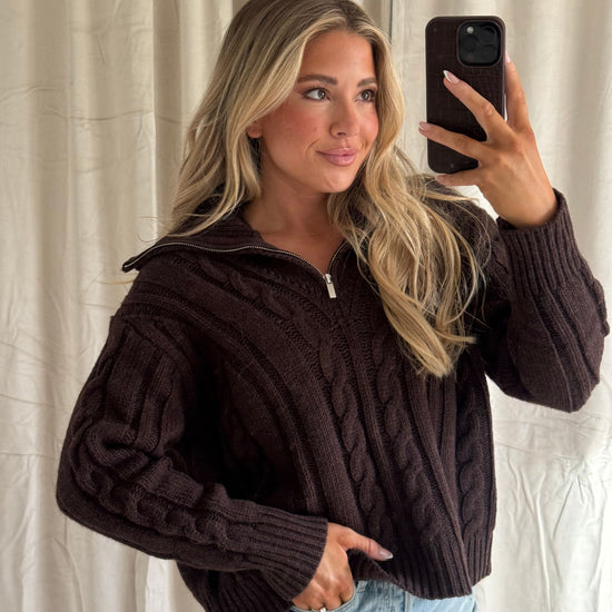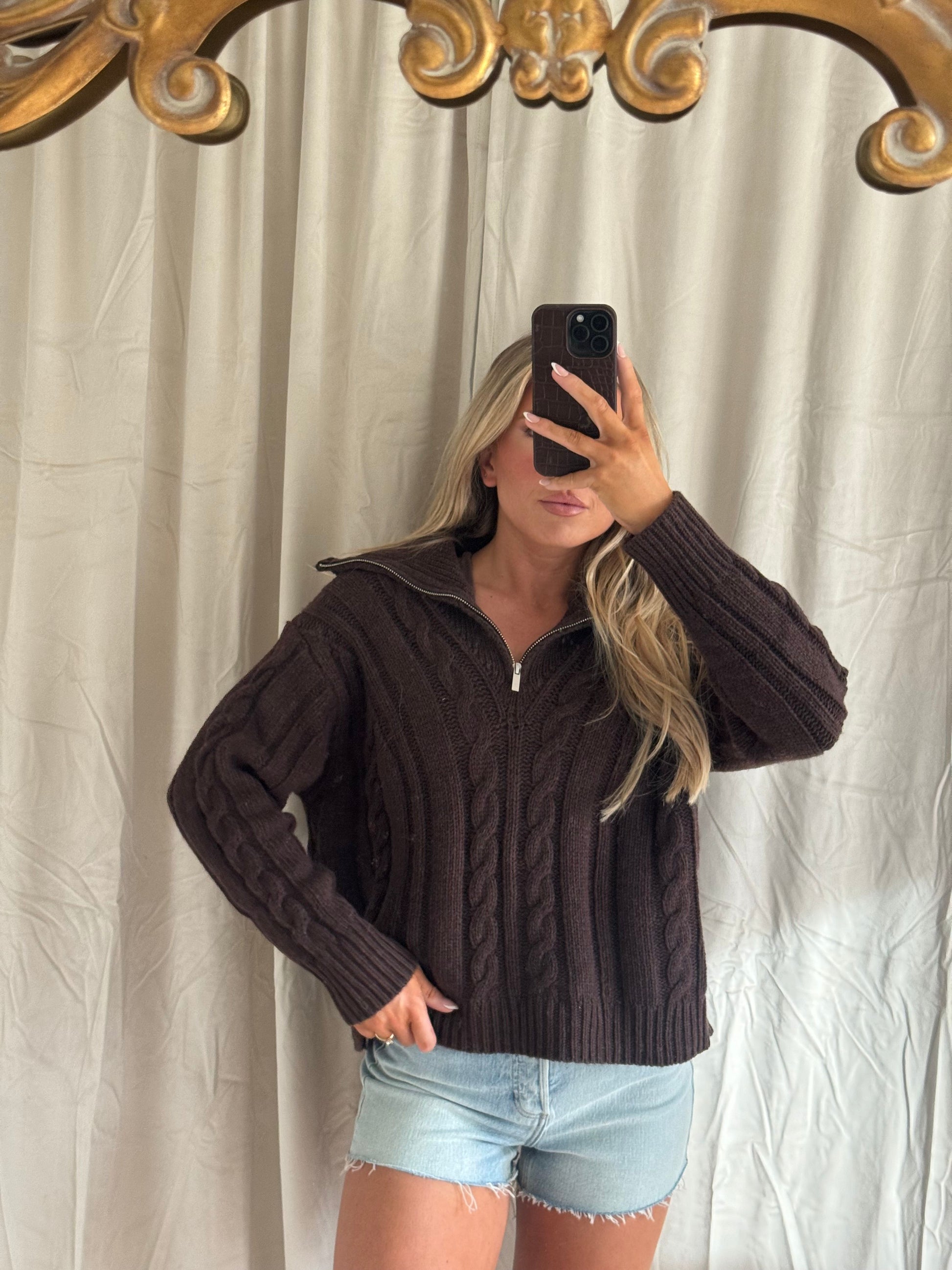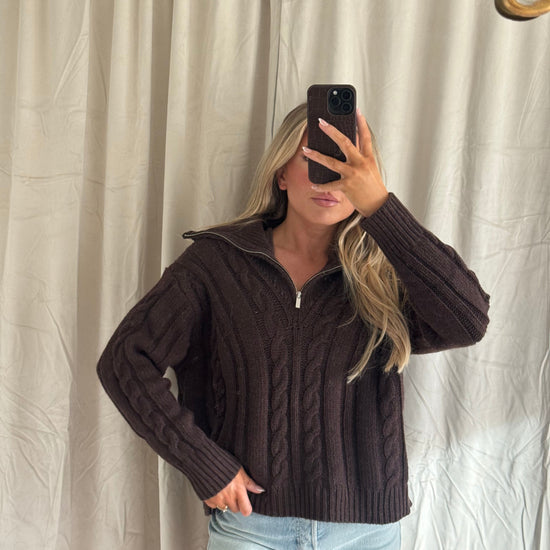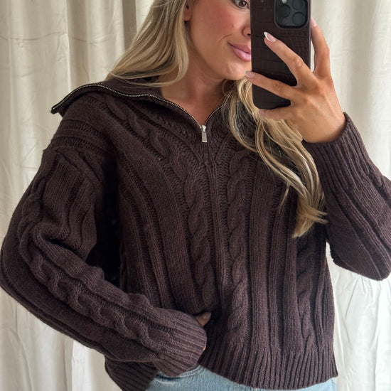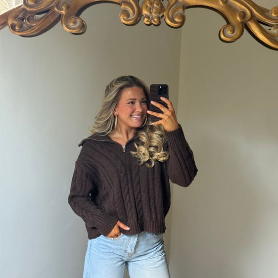 Our Sienna Sweater features a long sleeve and a zipper front cable knit material.