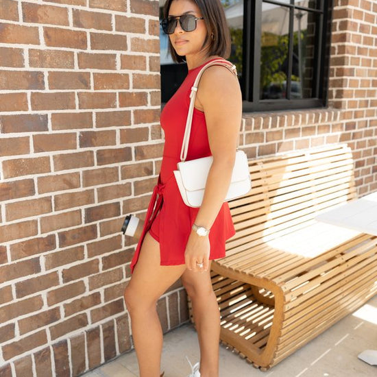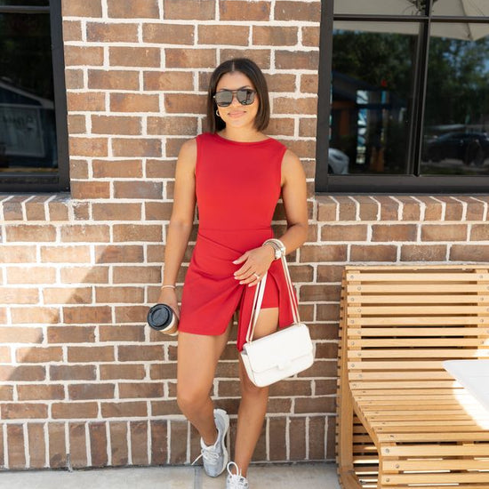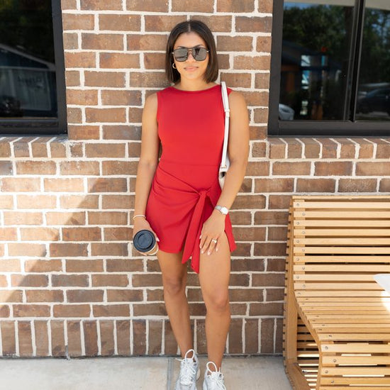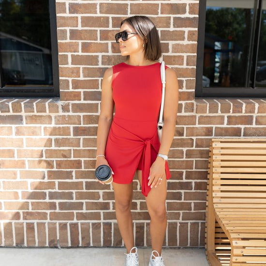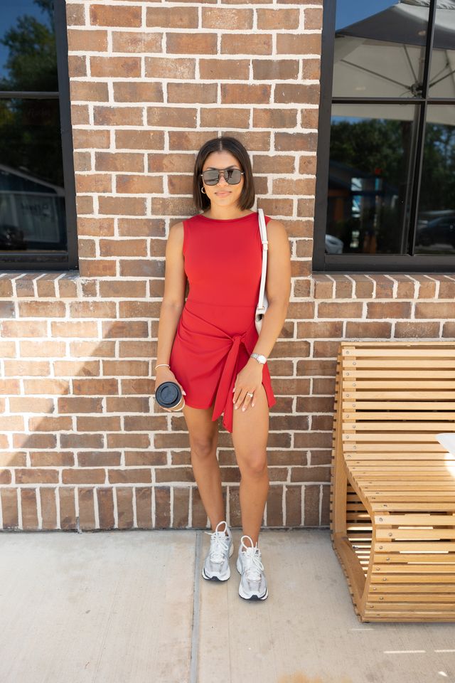 This sleeveless dress features a fun wrap tie front and comfy built-in shorts. Made from moisture-wicking fabric (75% Nylon, 25% Spandex), it keeps you feeling fresh all day. Available in lengths: S - 28”, M - 29”, L - 30”.