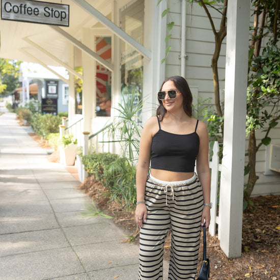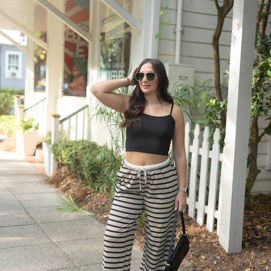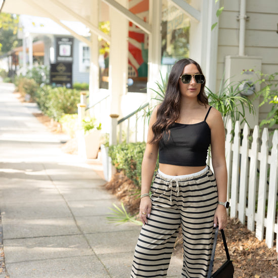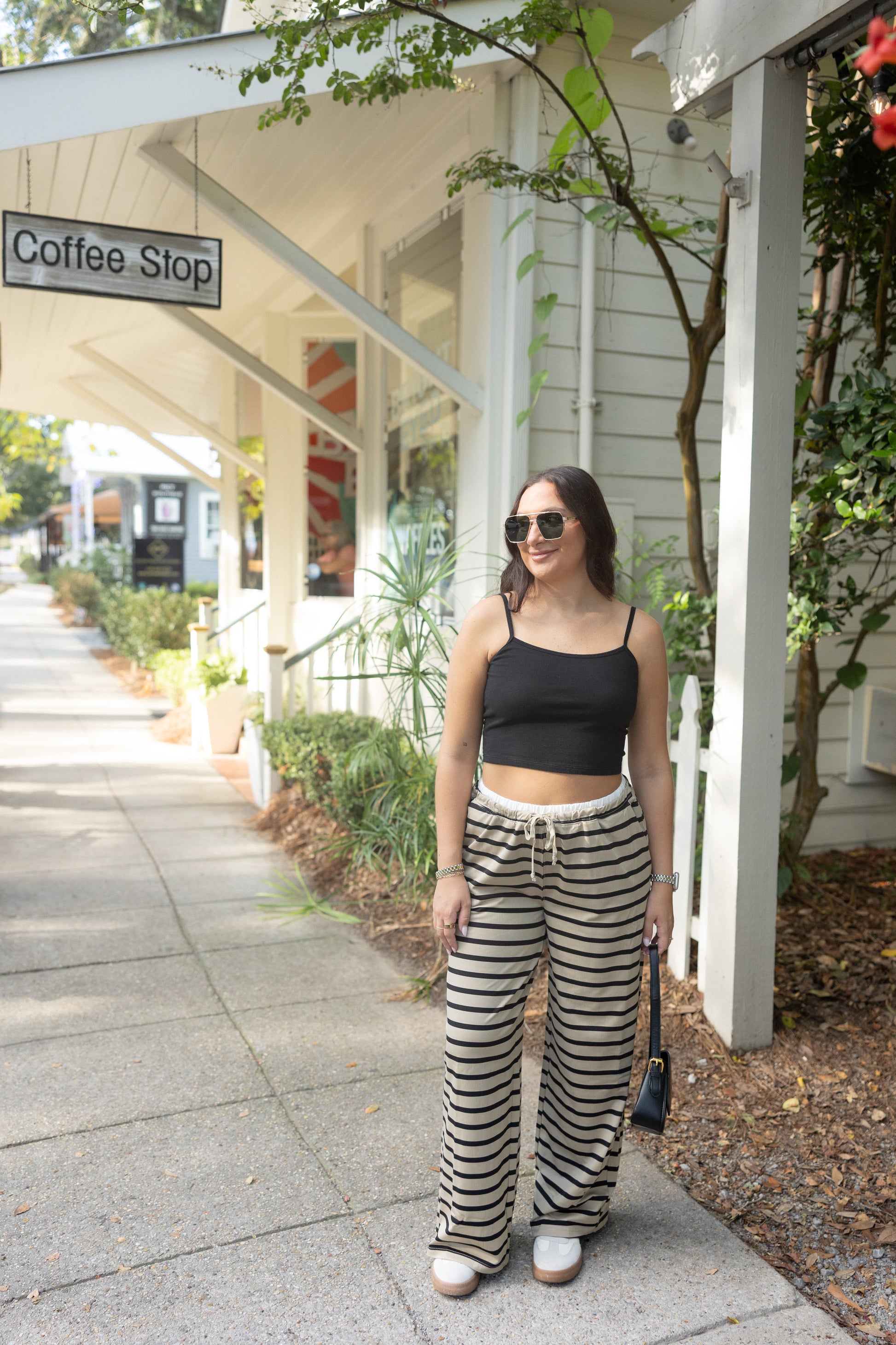 Slide into the Peyton Lounge Pants for a perfect mix of comfort and cool. These striped knit pants boast a cozy drawstring waist for an adjustable fit, making lounging or casual outings a breeze. Their relaxed silhouette flows effortlessly, bringing playful ease to your everyday style. Whether you're kicking back indoors or strolling outside, these pants have you covered in soft, draped comfort with a fun, laid-back vibe.