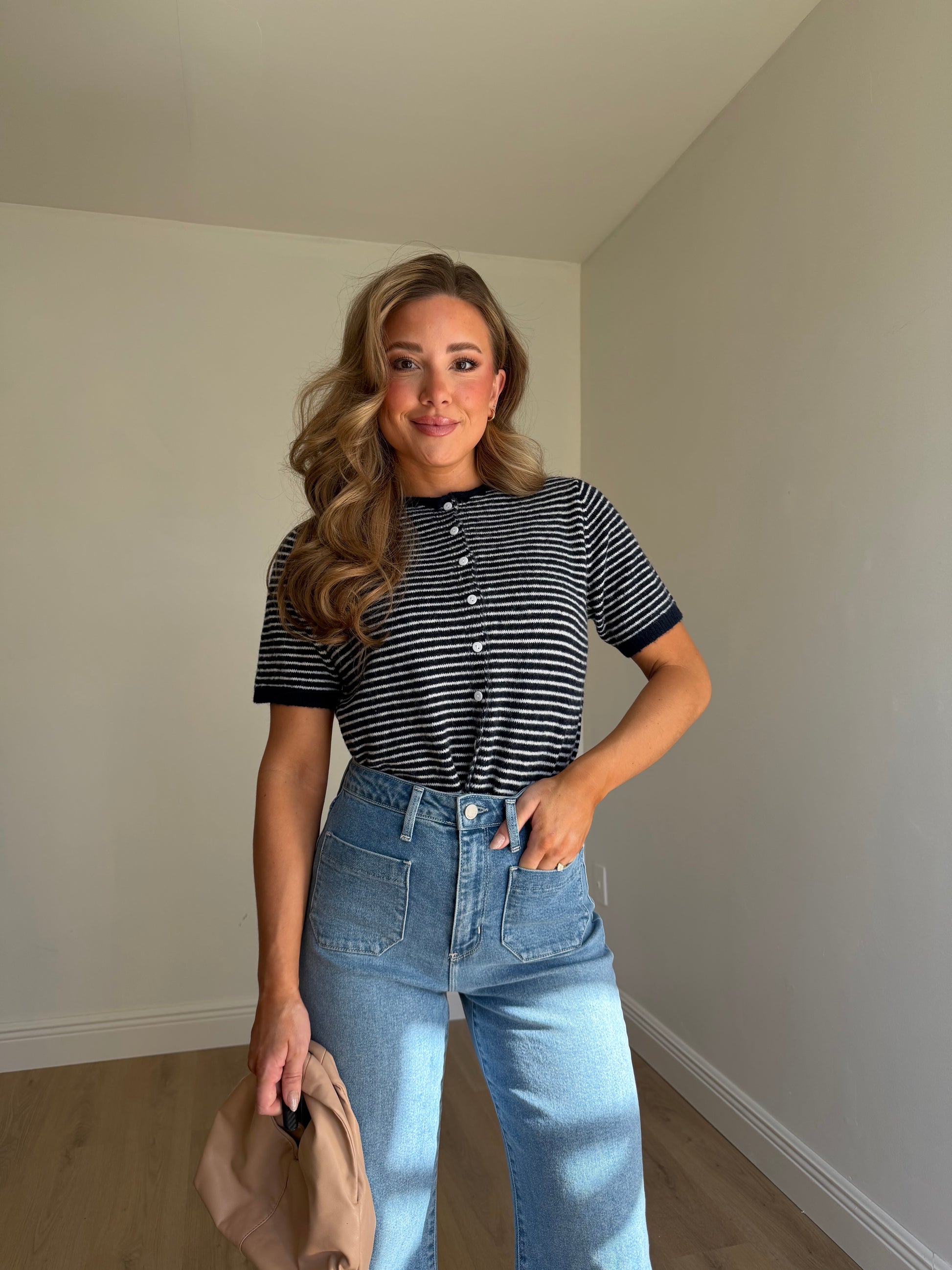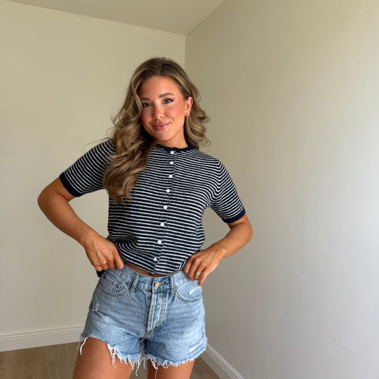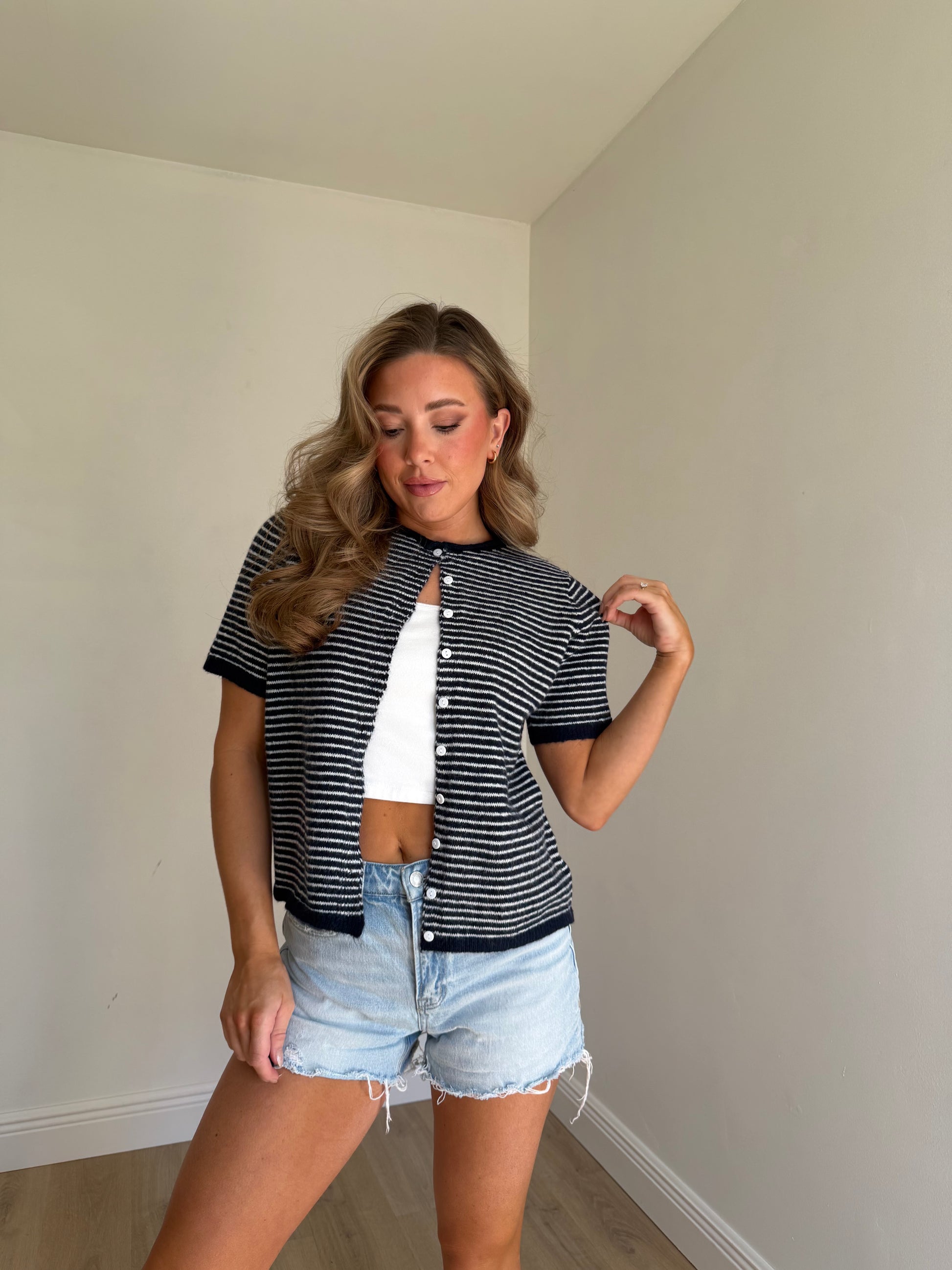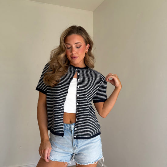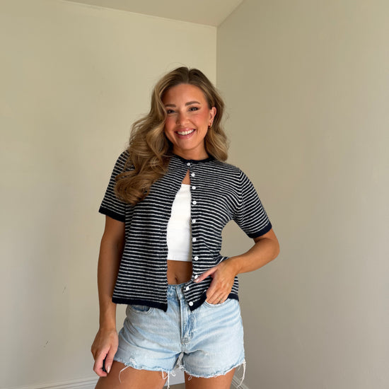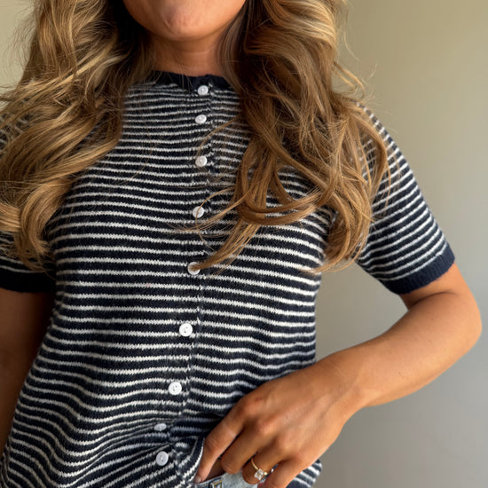 Knit from a soft, lightweight fabric, this short sleeve cardigan features a relaxed fit with fine horizontal stripes, a round neckline, and a full button-front closure with tonal buttons. The cozy yet breathable texture makes it an easy layering piece through the seasons - style it buttoned up as a top or open over tanks and dresses for a softly polished everyday look.