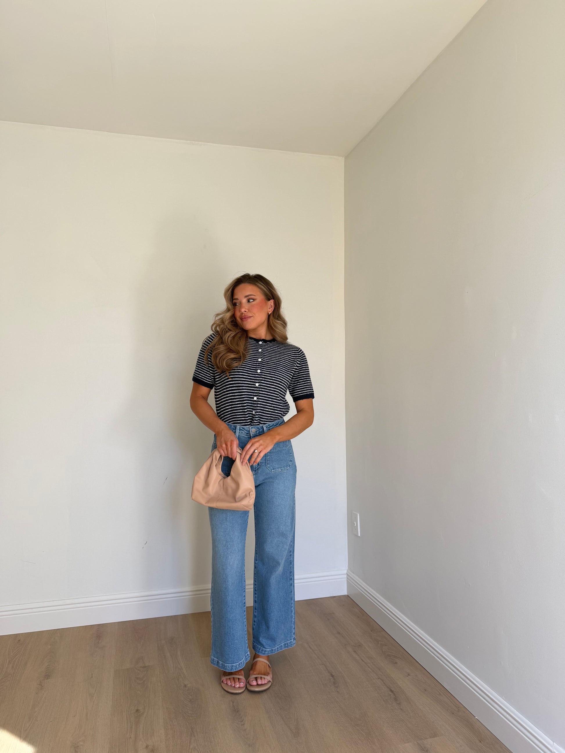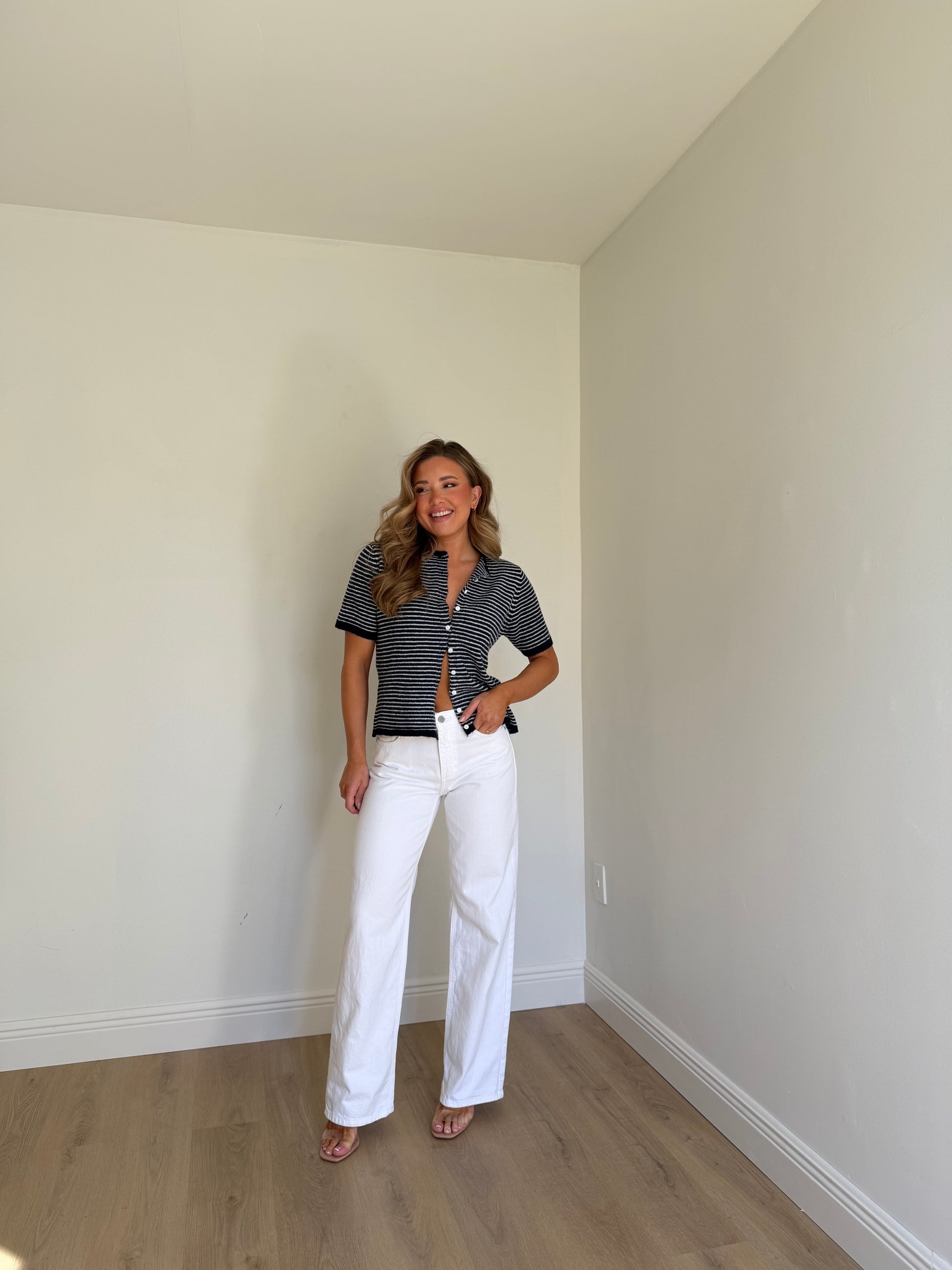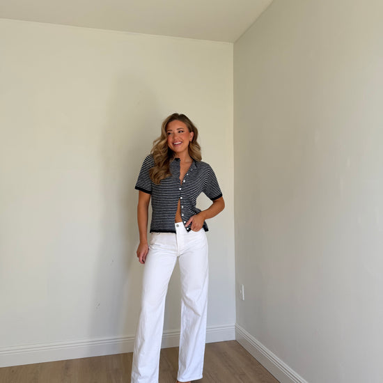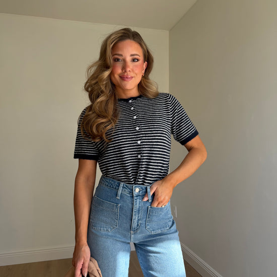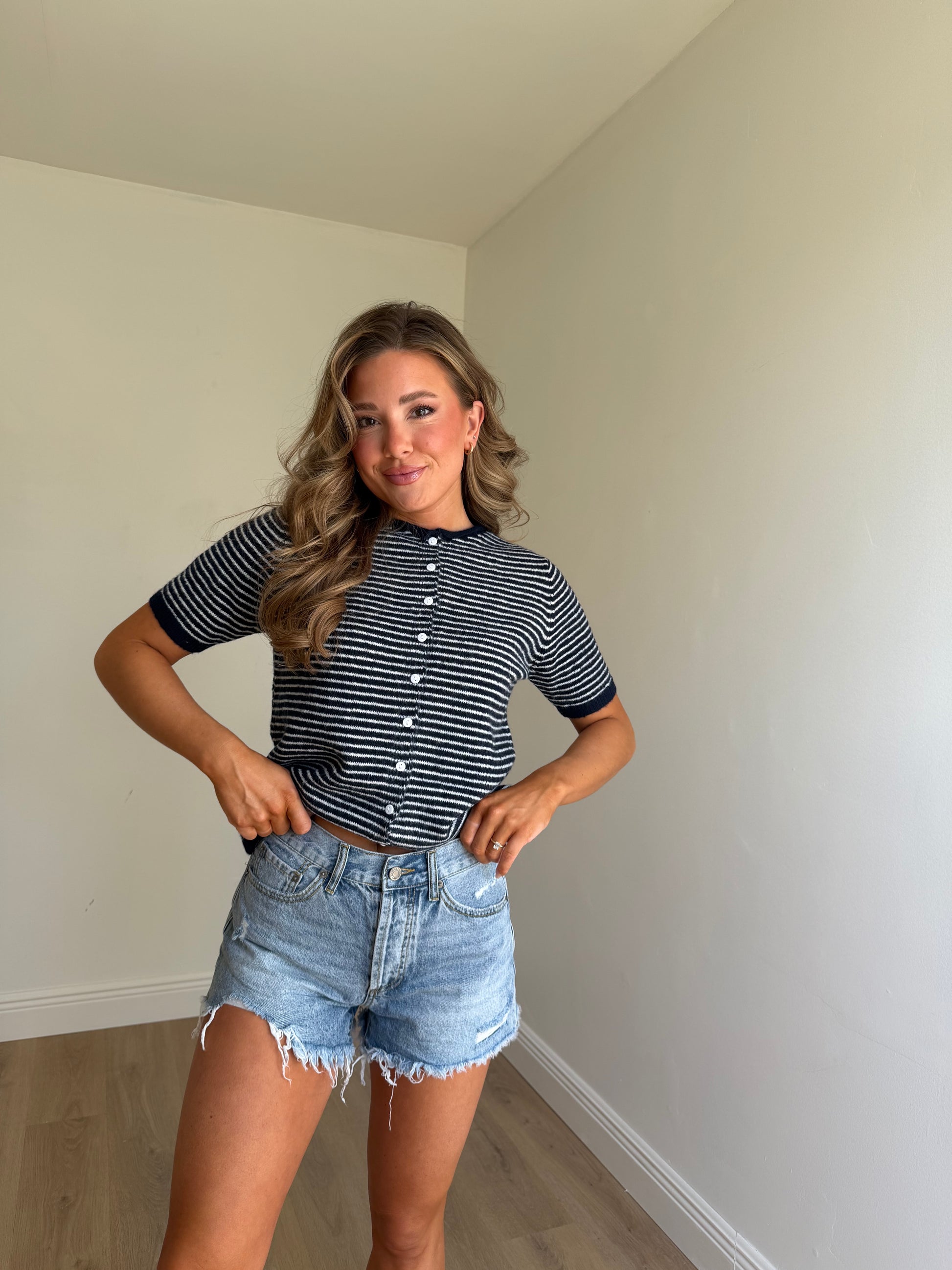Knit from a soft, lightweight fabric, this short sleeve cardigan features a relaxed fit with fine horizontal stripes, a round neckline, and a full button-front closure with tonal buttons. The cozy yet breathable texture makes it an easy layering piece through the seasons - style it buttoned up as a top or open over tanks and dresses for a softly polished everyday look.