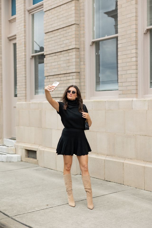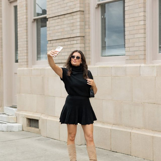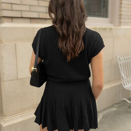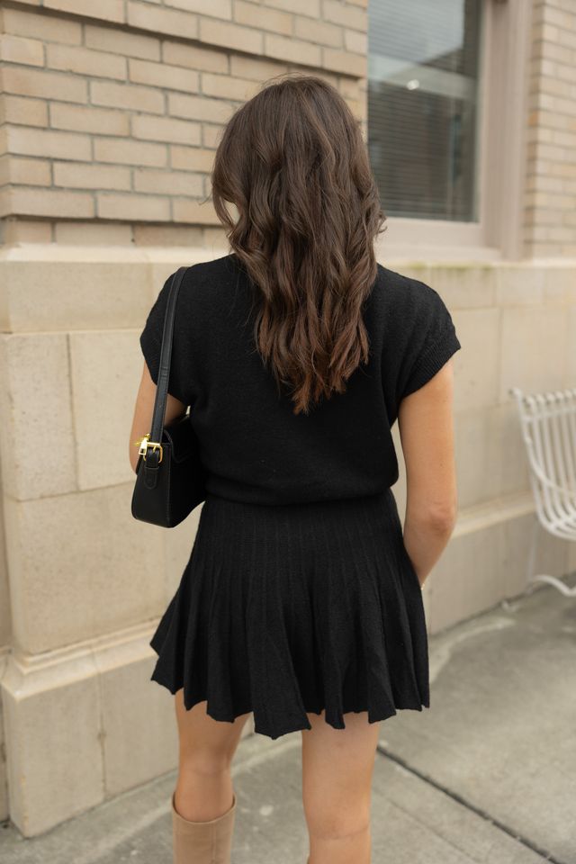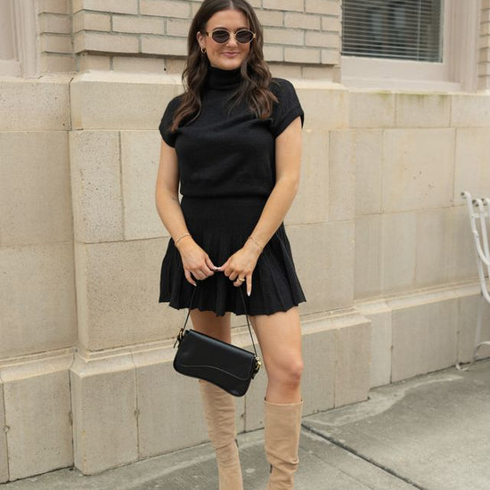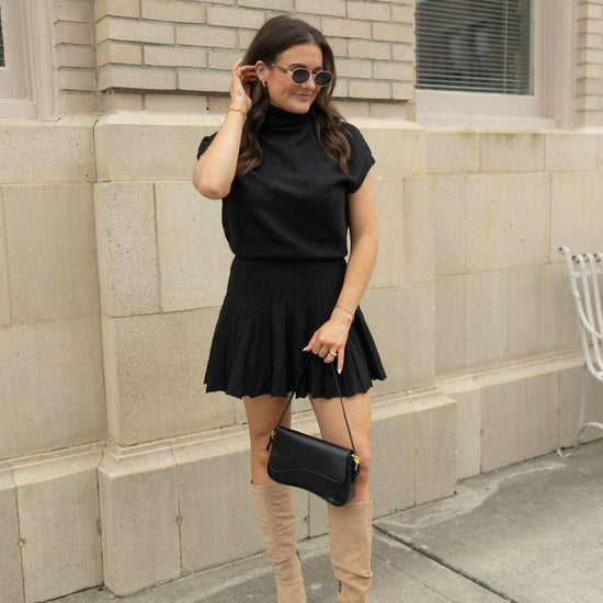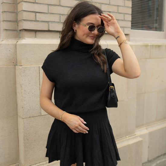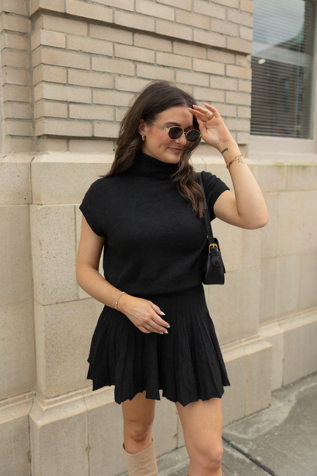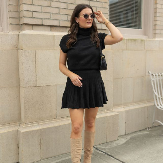 Embrace elegance with this coordinated set featuring a plush turtleneck top and a dynamically pleated skirt. The top's snug fit and structured cap sleeves enhance comfort, while the skirt's fluttering pleats offer a playful yet refined silhouette. Perfect for versatile styling, this set transitions effortlessly from brunch to a sophisticated evening. Pair with sleek boots or layer with a tailored blazer for season-spanning chic.