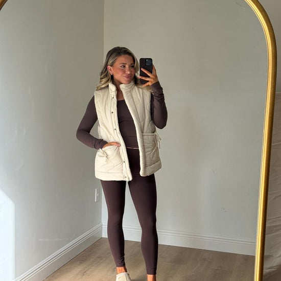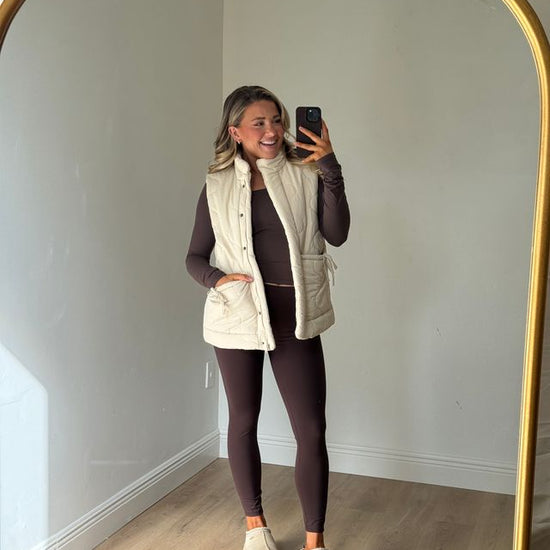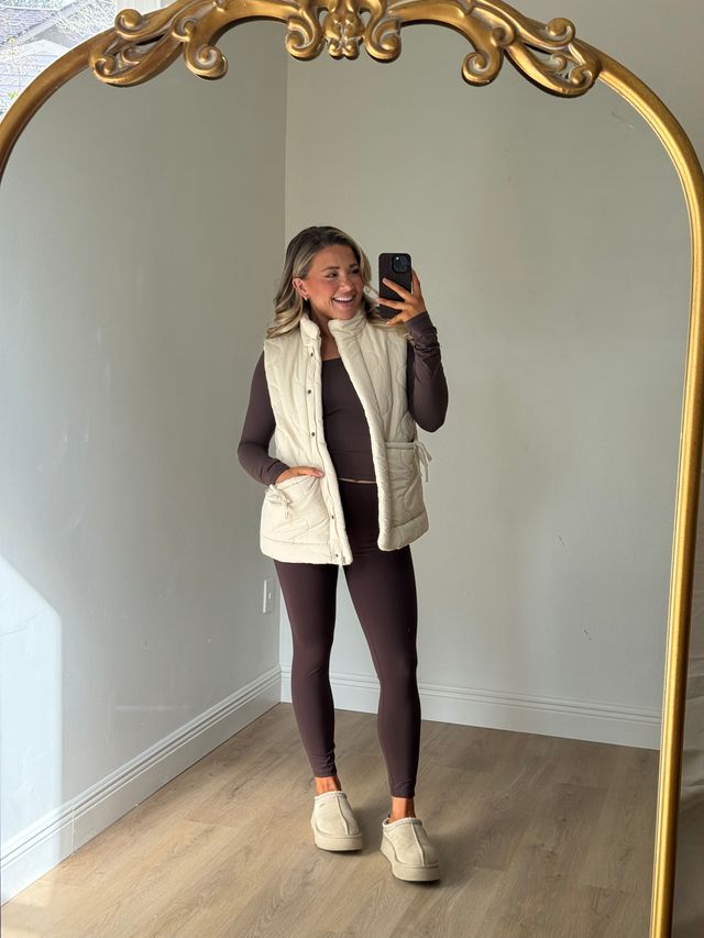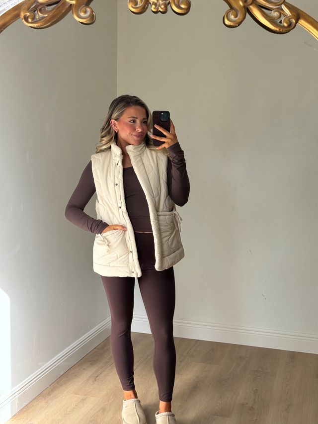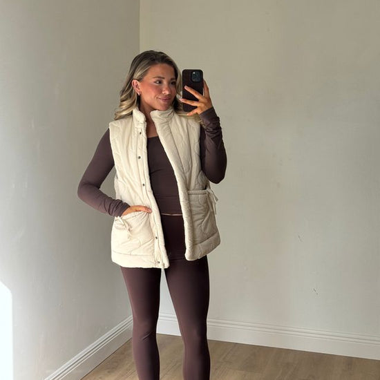 Embrace cooler days with this sleeveless puffer jacket, featuring distinctive wave quilting and drawstring ties at the waist for an adjustable fit. Ideal for layering over a long-sleeve tee or under a coat for extra warmth.